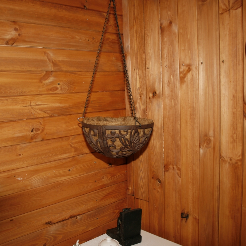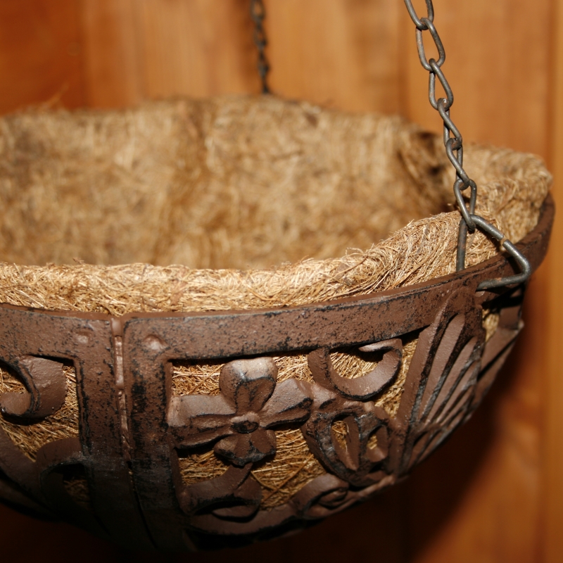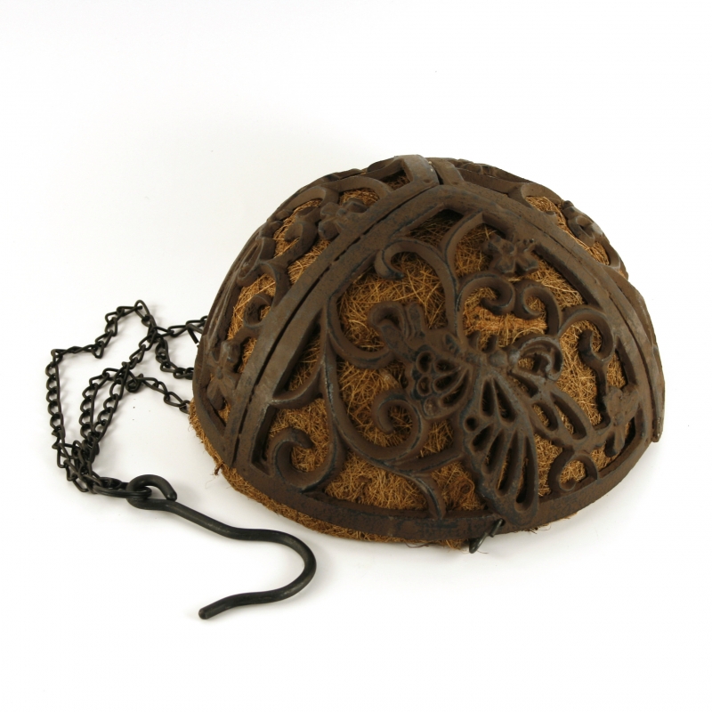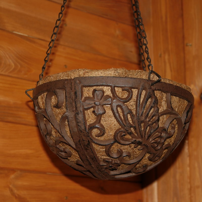 Záves na kvety má priemer 27 cm a je vysoký 27 cm . Ak ho budeme merať až k liatinovému háčika na zavesenie , je vysoký 66 cm .