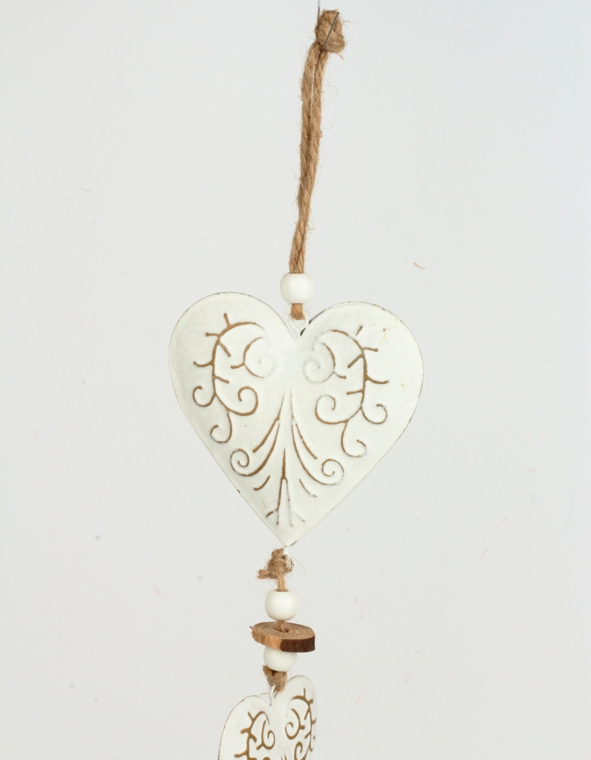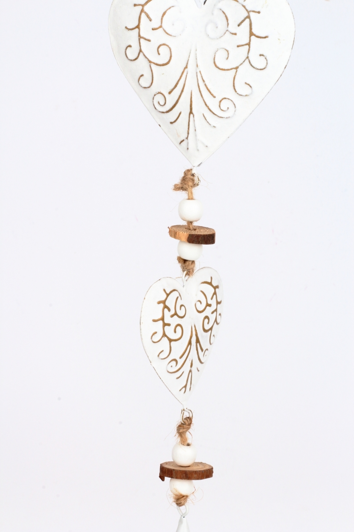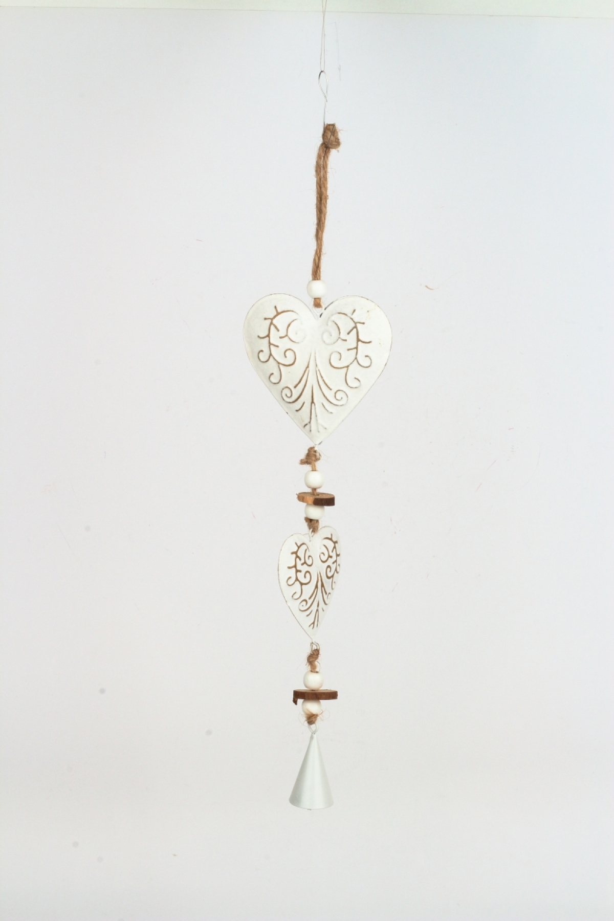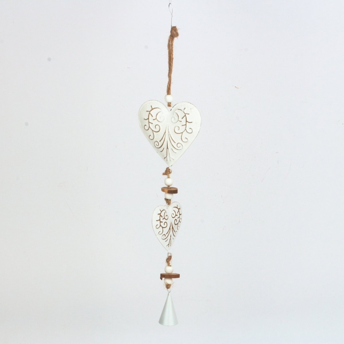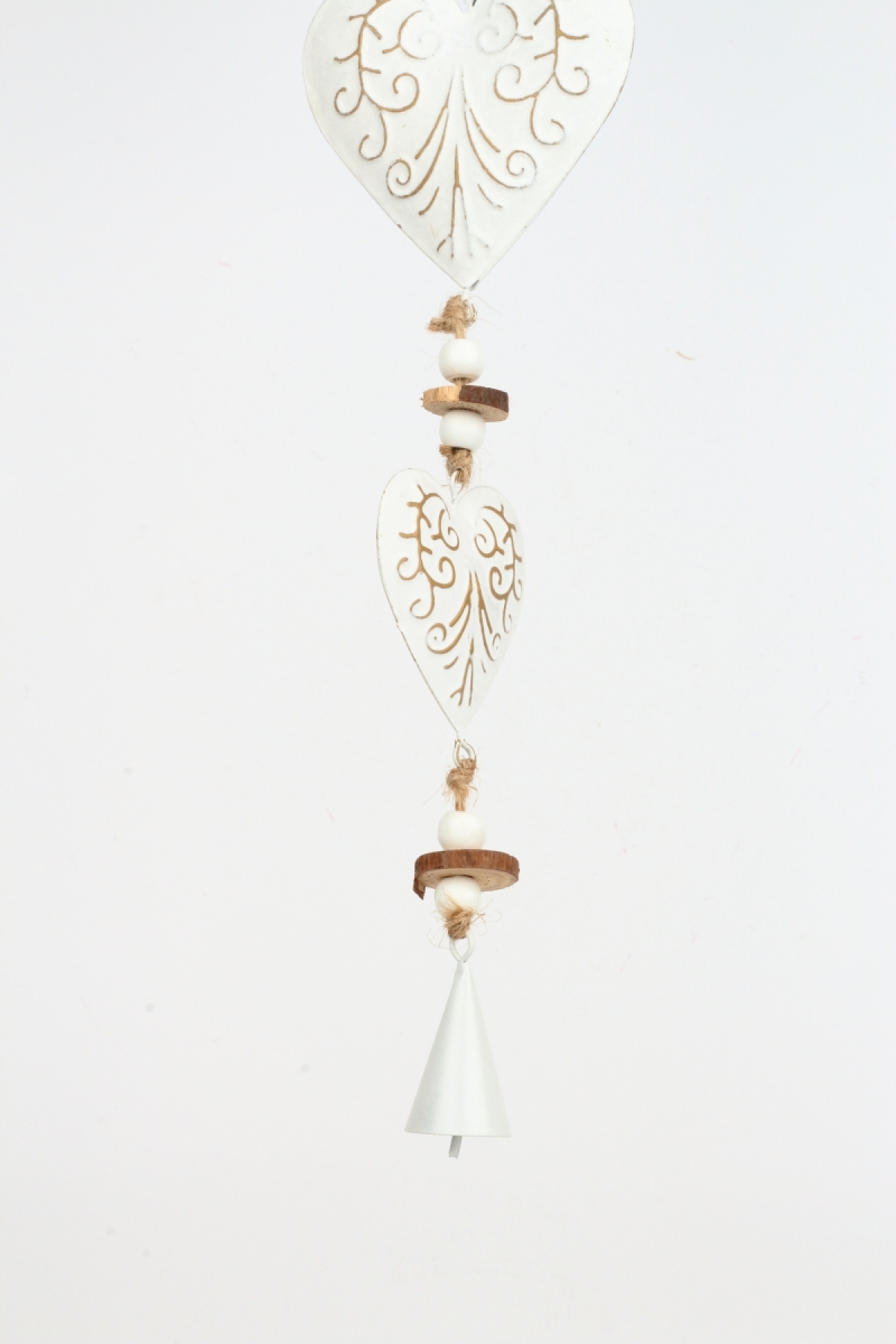 Závesná dekorácia srdiečka so zvončekom. Pod bielou patinou idú vidieť krásne ornamenty.