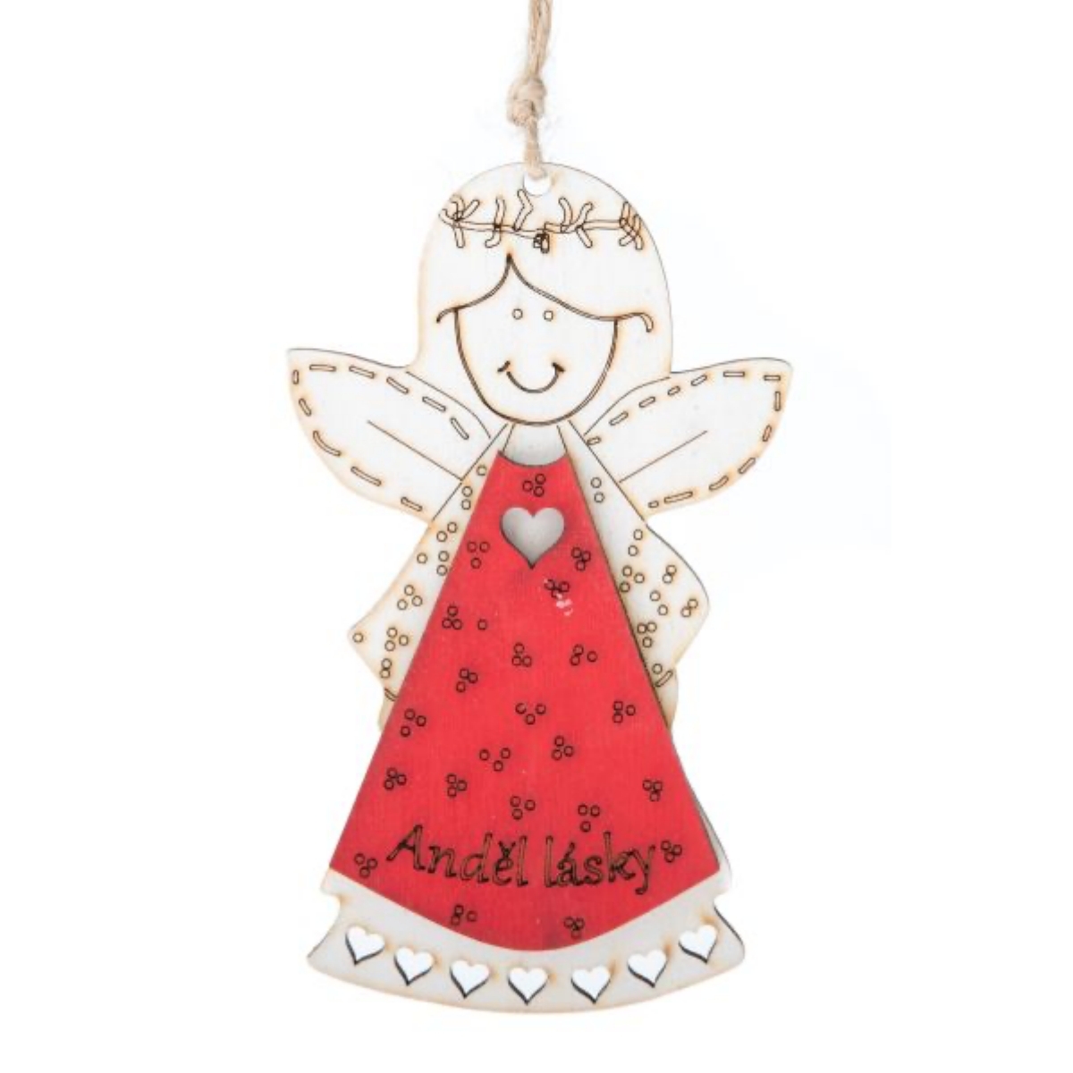 Závesná dekorácia Anjel lásky červený s nápisom v 13 cm drevený