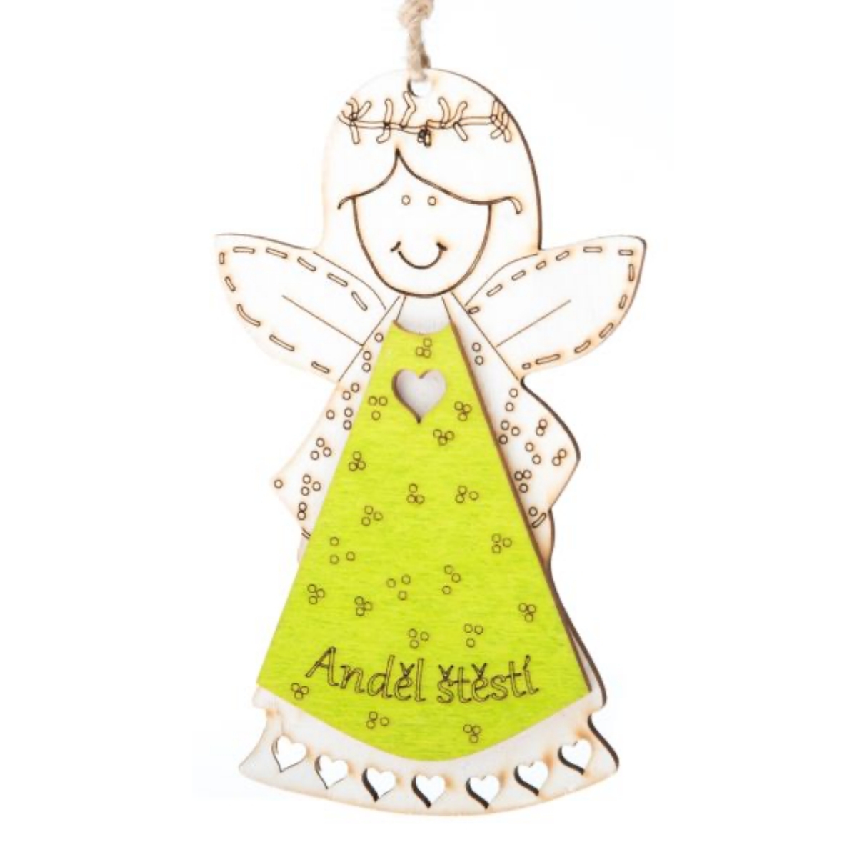 Anjel je vyrobený technológiou laserového vyrezávania a gravírovania, čo mu prepožičiava charakteristické tmavohnedé rezné plochy a vypálené kresby. Ide o závesnú dekoráciu s nápisom, anjelik má totiž v spodnej časti šiat nápis Anjel šťastia. Možno ho zavesiť pomocou očka z režného povrázku.