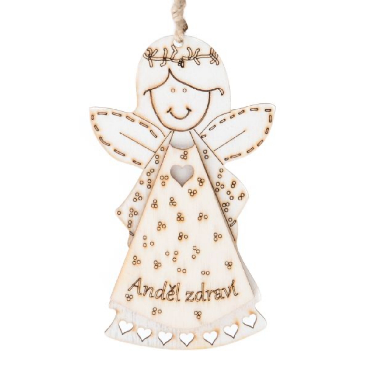 Usmievavý drevený anjelik s nápisom Anjel zdravia, ktorý sa nachádza v spodnej časti jeho šiat. Roztomilá závesná dekorácia vo farbe prírodného dreva, je vhodná ako talizman zdravia pre vašich blízkych. Poteší ako drobný darček, ktorý vás obdarovanému vždy pripomenie.