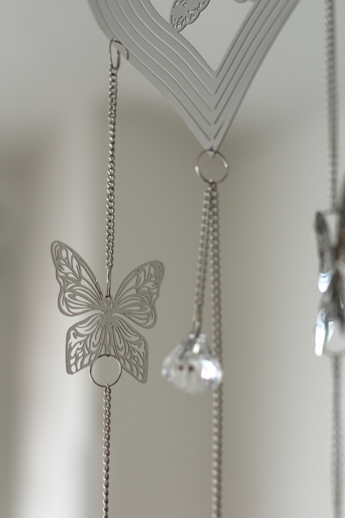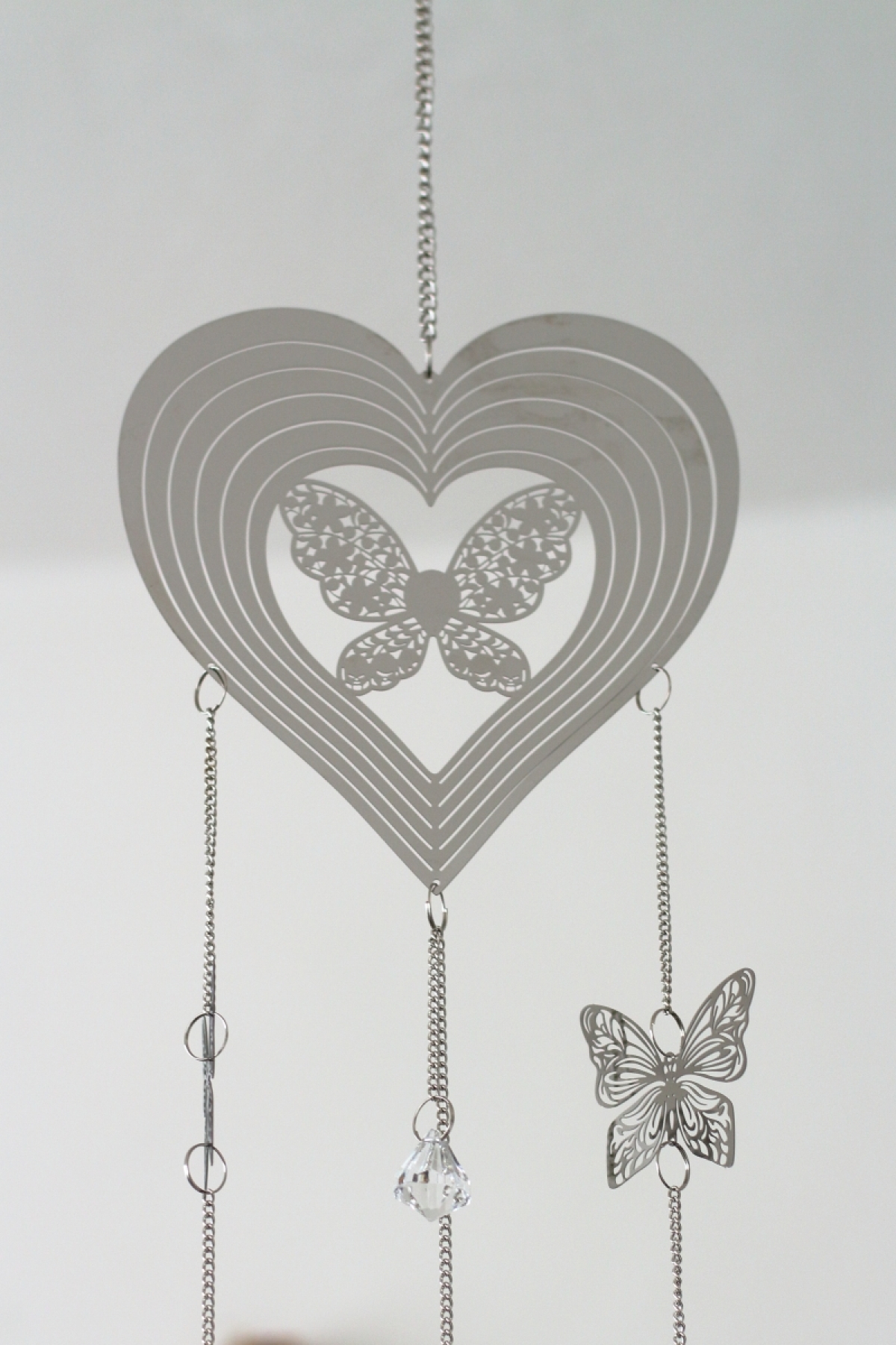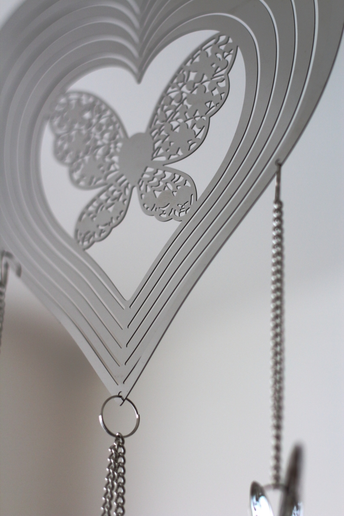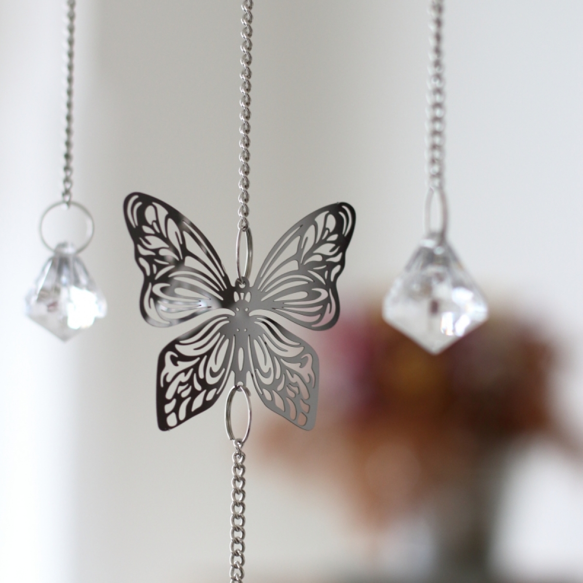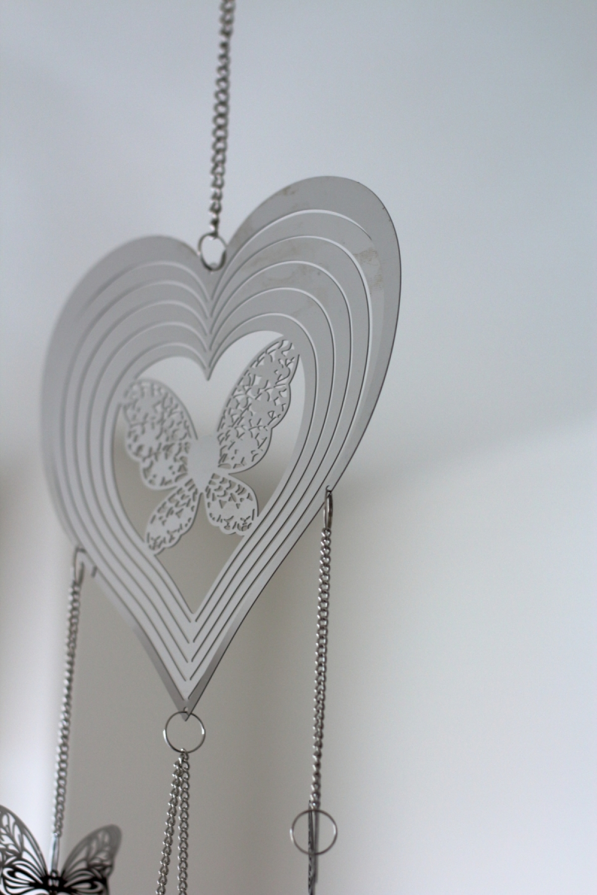 Závesná dekorácia do bytu na kovovej retiazke. Závesná dekorácia je vyrobená z plechu a zavesená na kovovej retiazke.