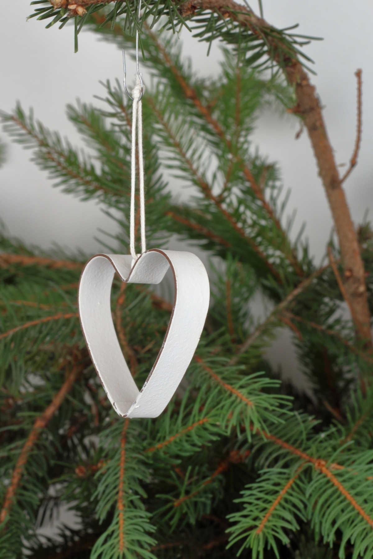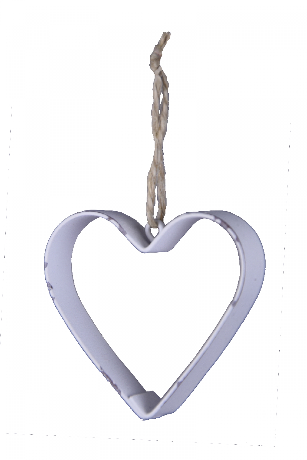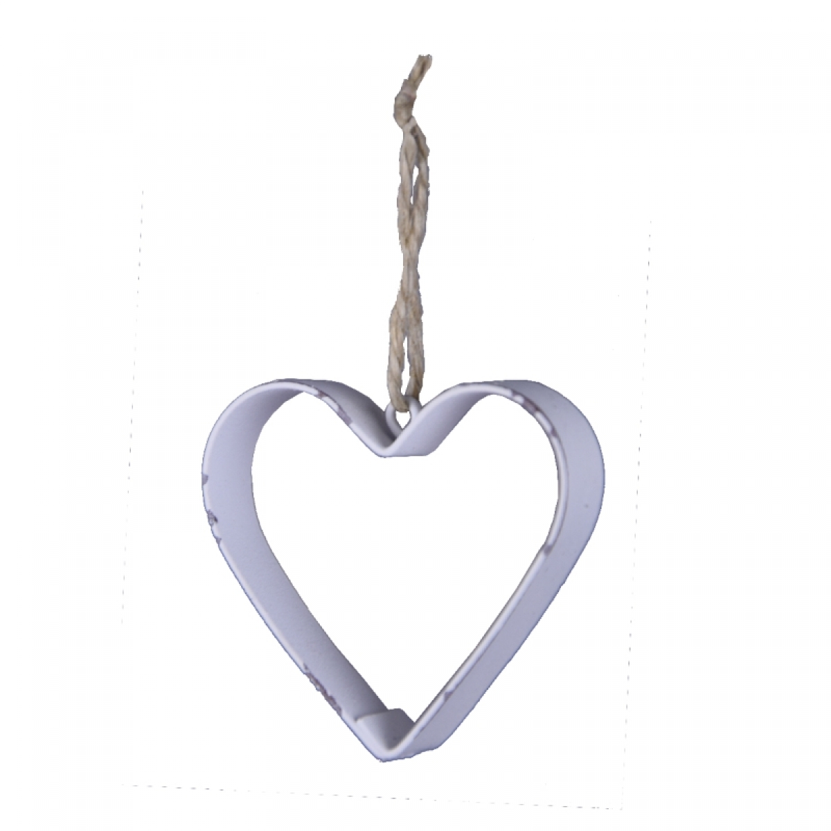Kovové srdiečko je zavesené na jutovom povrázku.