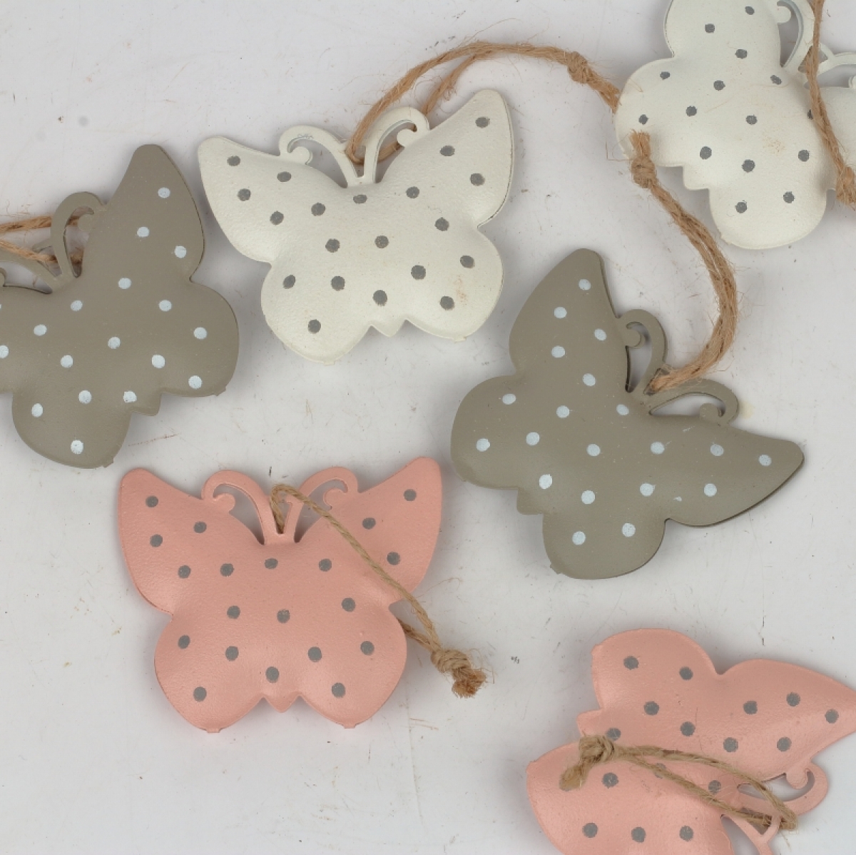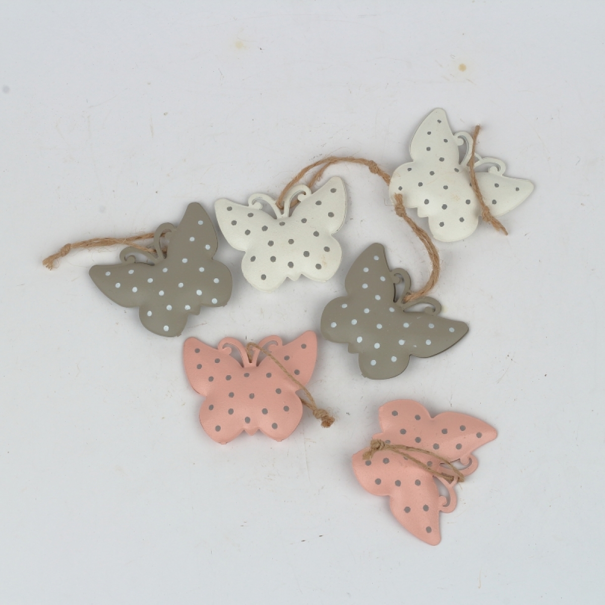 Každý plechový motýľ má šnúrku na zvěšení a vnútri rolničku.
