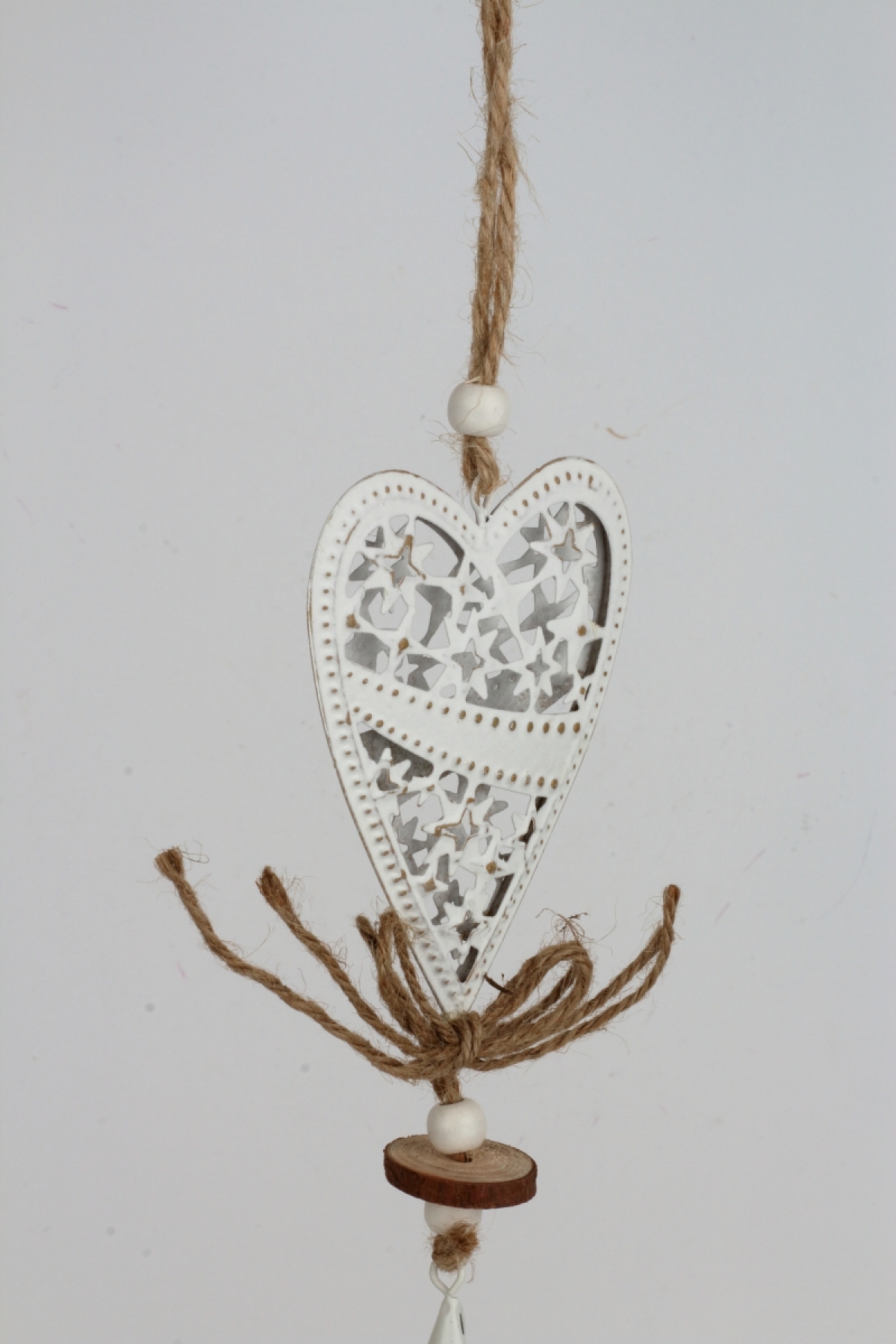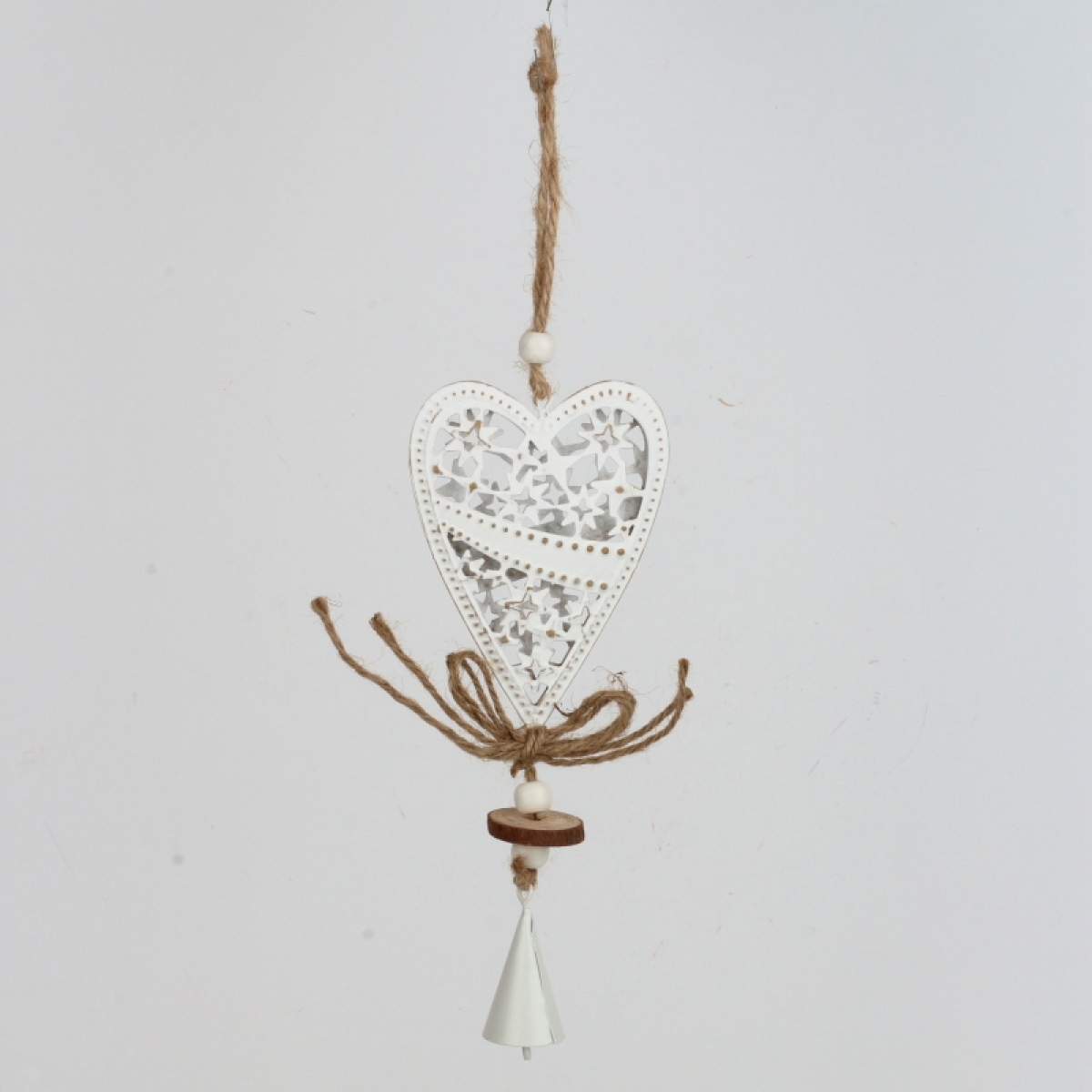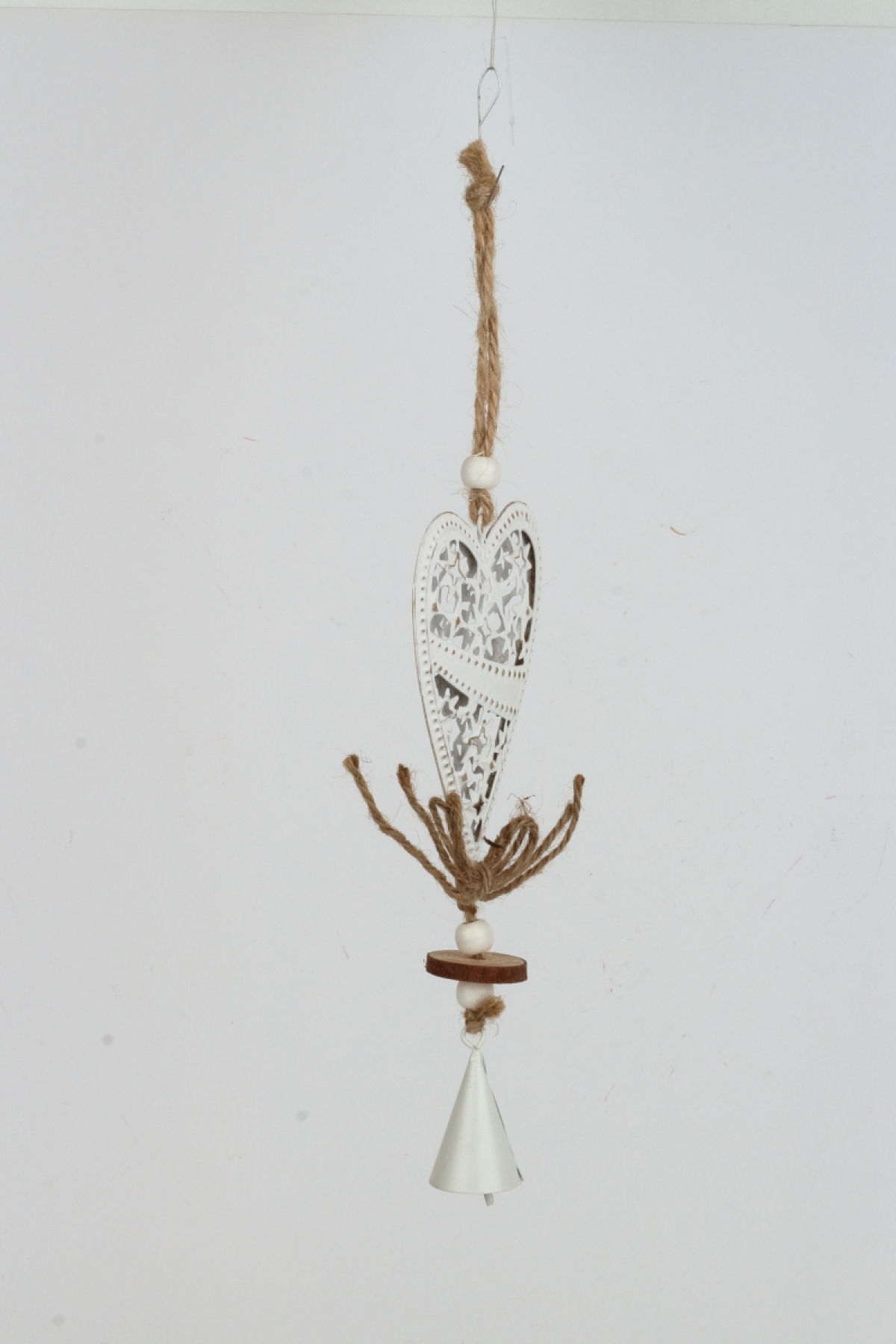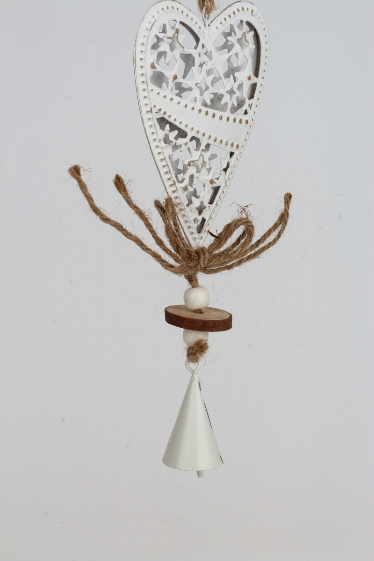 Závesná dekorácia v podobe plechového srdiečka so zvončekom, zavesené na jutovom povrázku.