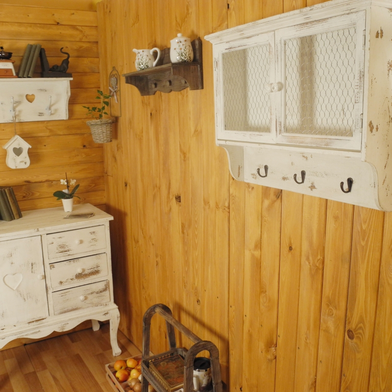 V spodnej časti bielej skrinky sú zavesené tri praktické kovové háčiky. Skrinka je vyrobená prevažne z dreva, ktoré má retro biely náter.