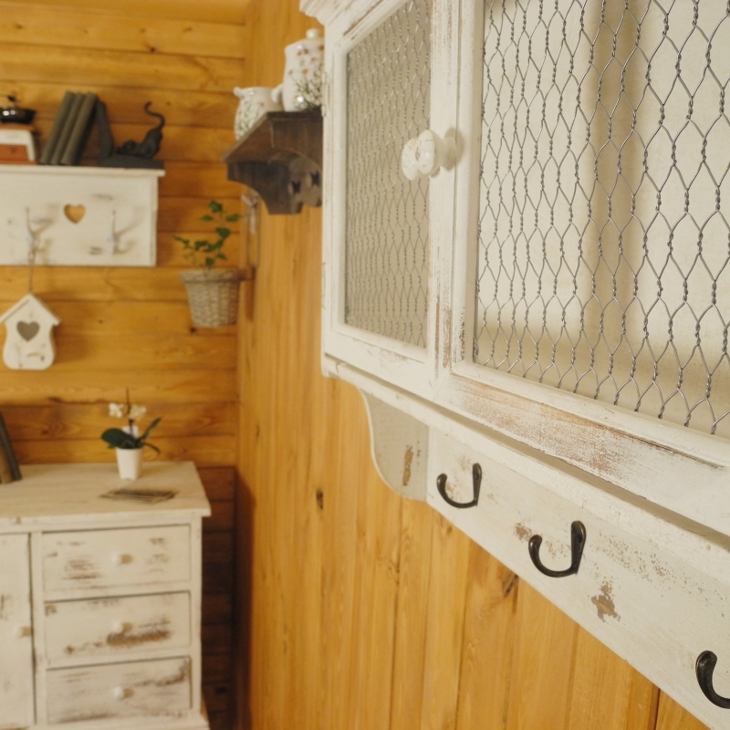 Závesná skrinka je zaujímavá vďaka kovovému pletive, ktoré je na jej výrobu a ozdobu použité.