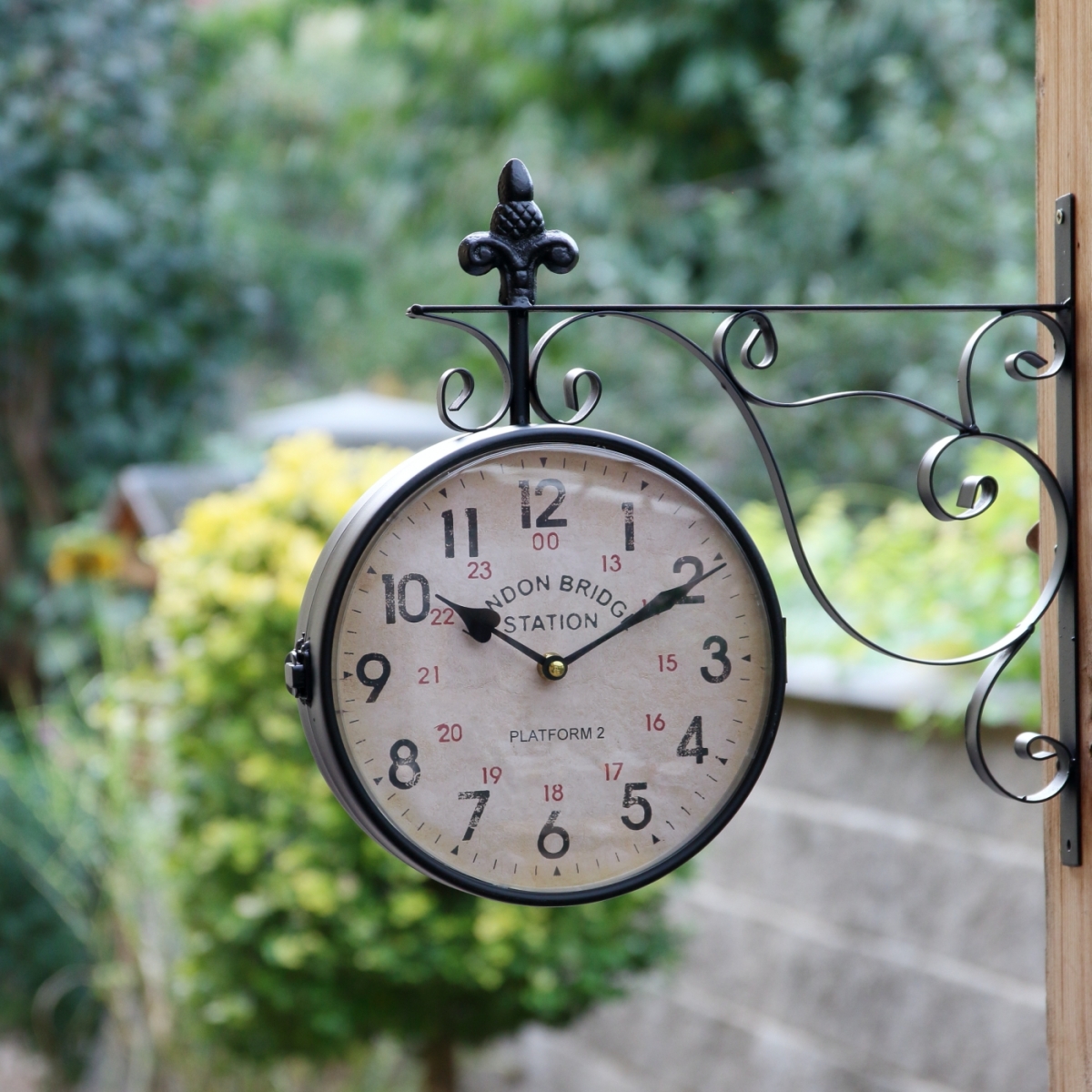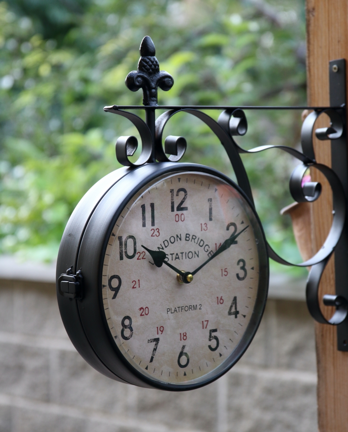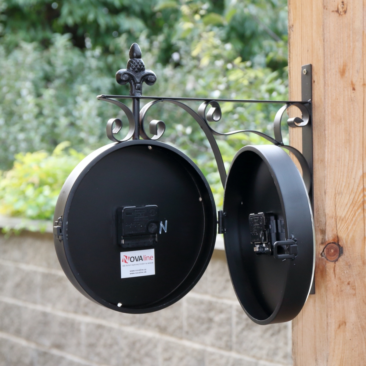 Tieto závesné hodiny na vás dýchnu starými časmi. Sú inšpirované starými železničným hodinami. Retro ciferník s patinou, ktorý je navyše obojstranný, sa vesí na ornamentálnu konzolu, ktorou pripevníte na stenu.Tmavo hnedé prevedenie evokuje dlhoročnú hrdzu.