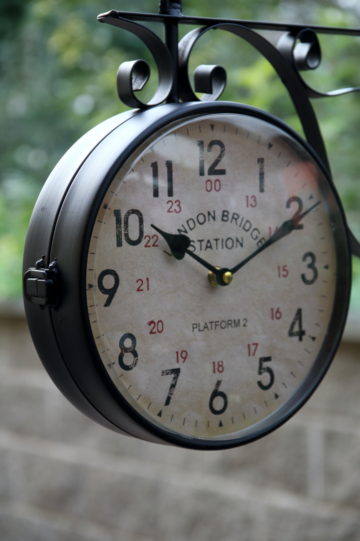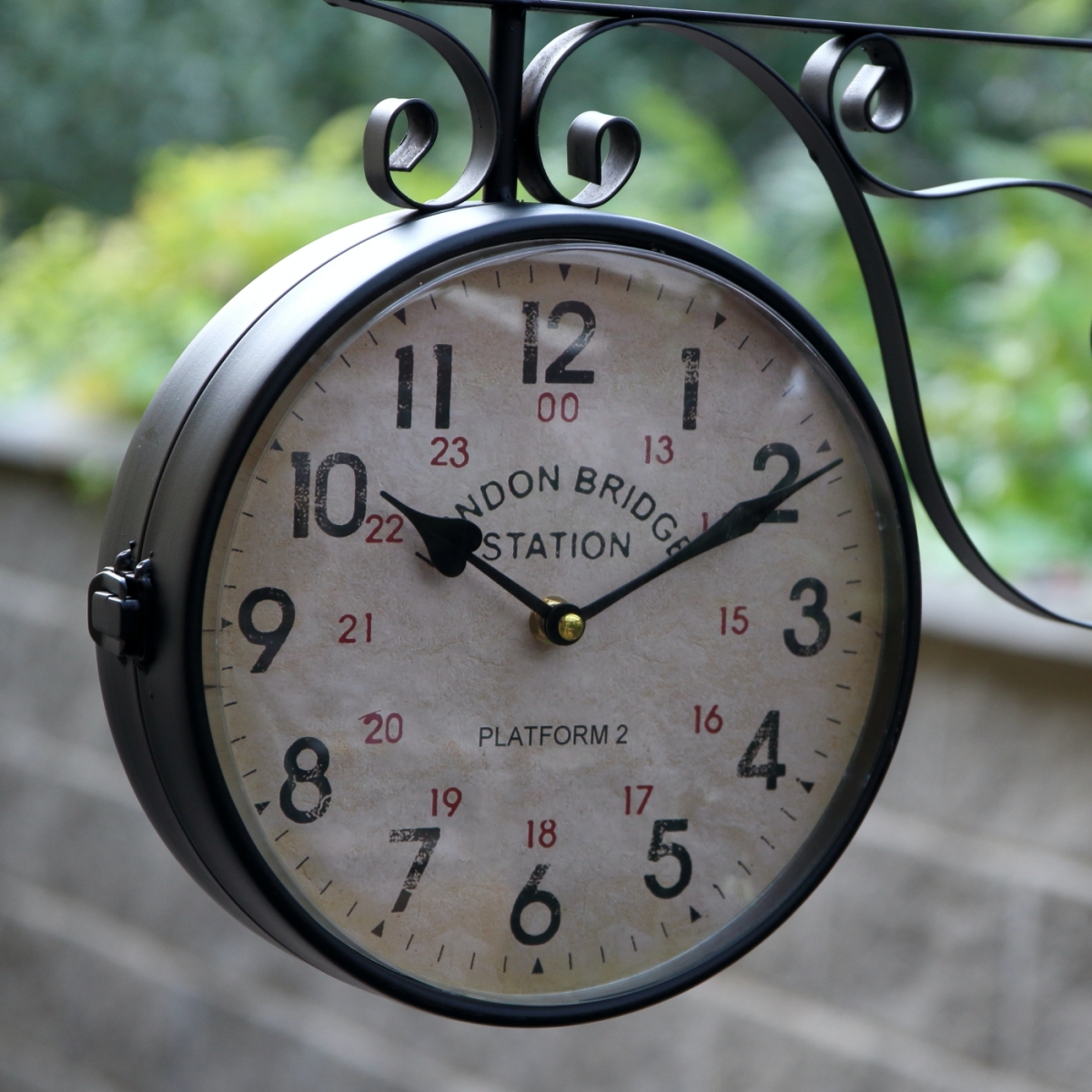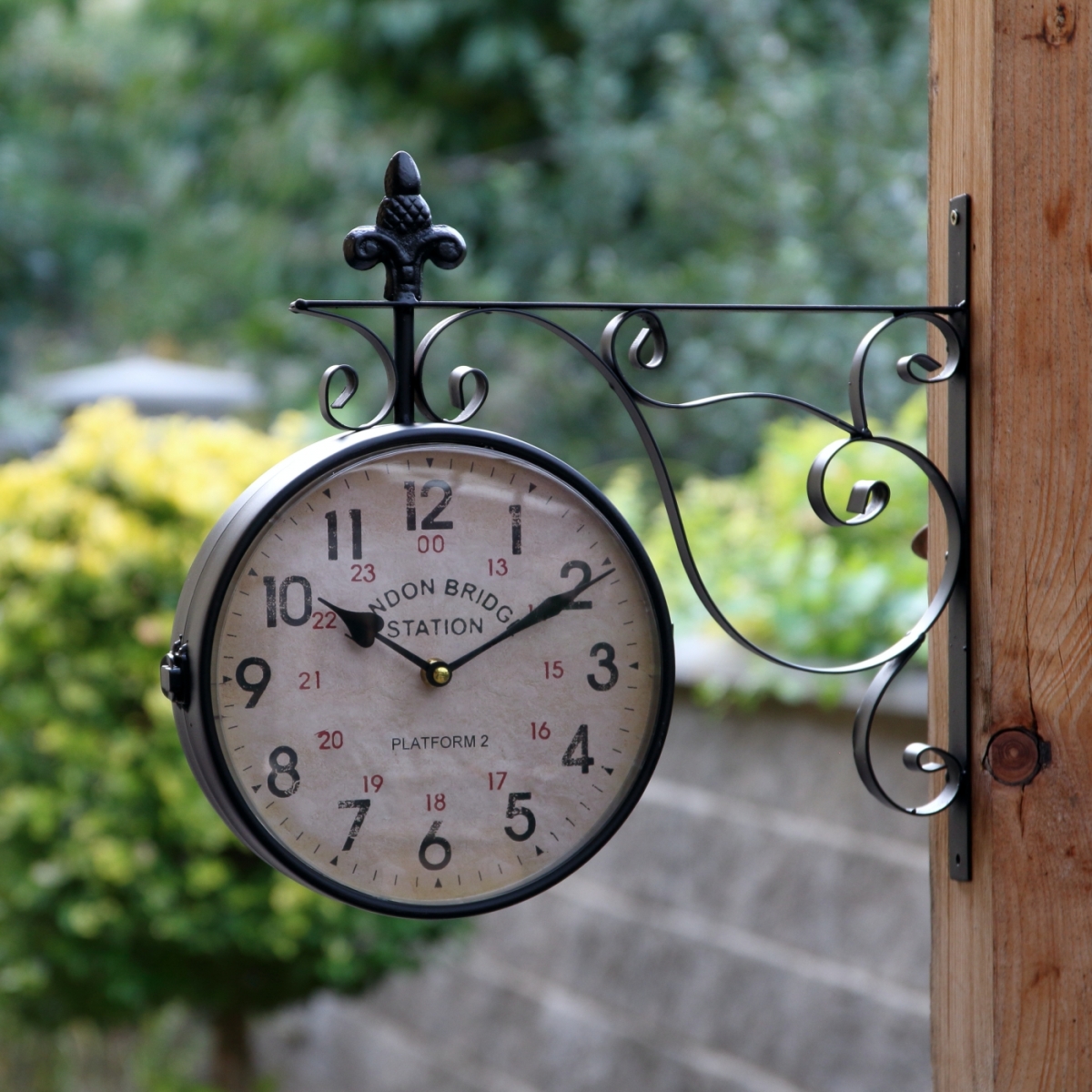 Tieto závesné hodiny na vás dýchnu starými časmi. Sú inšpirované starými železničným hodinami. Retro ciferník s patinou, ktorý je navyše obojstranný, sa vesí na ornamentálnu konzolu, ktorou pripevníte na stenu.Tmavo hnedé prevedenie evokuje dlhoročnú hrdzu.