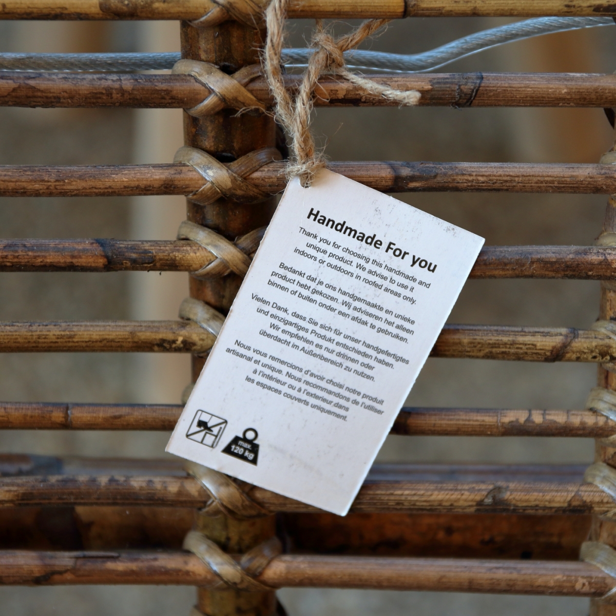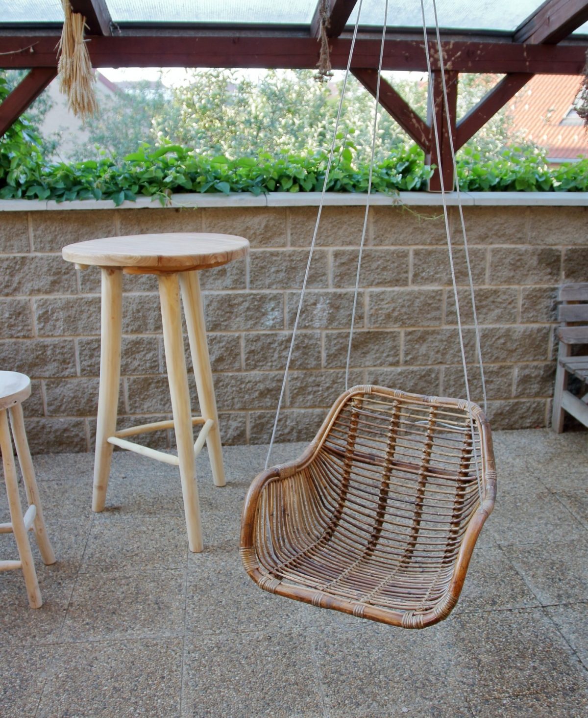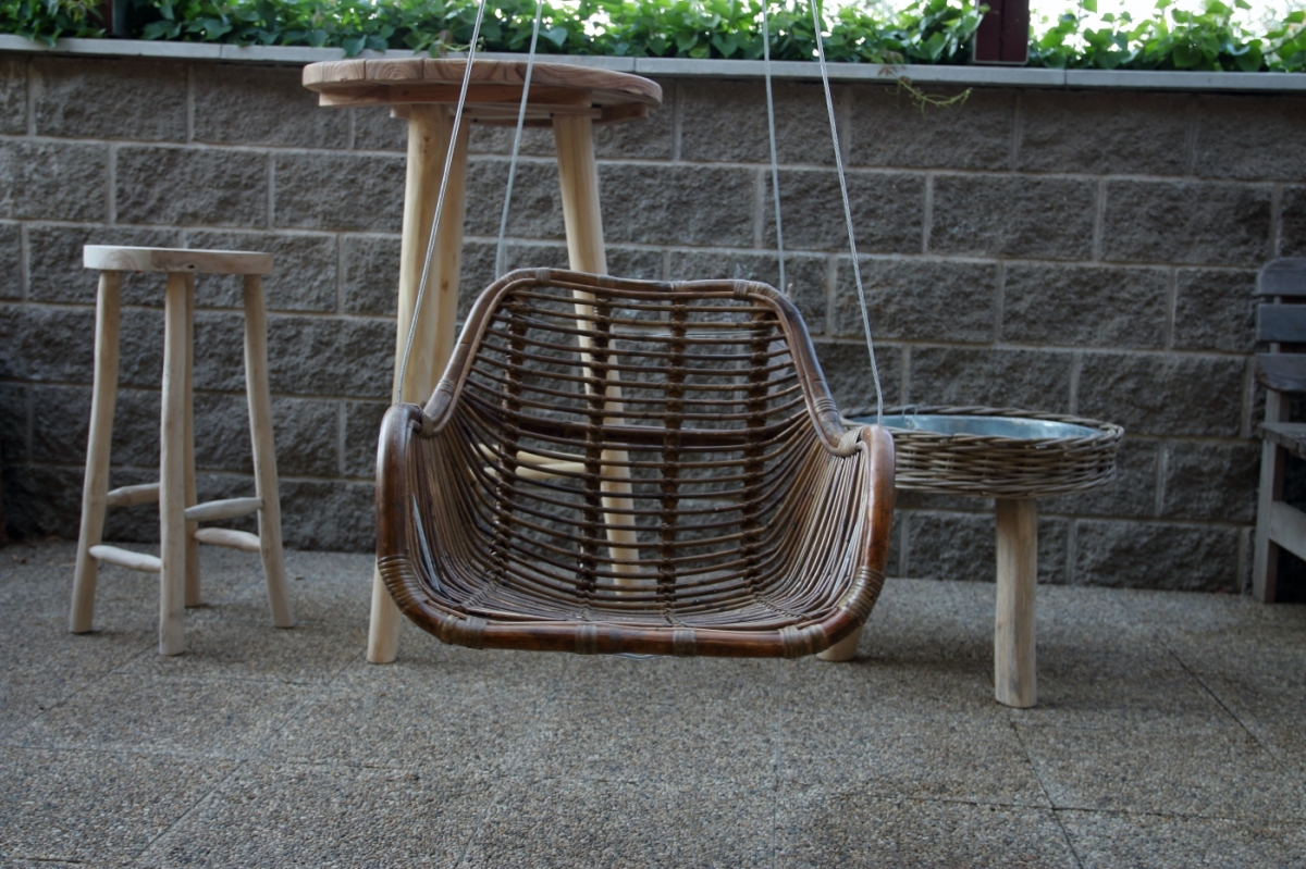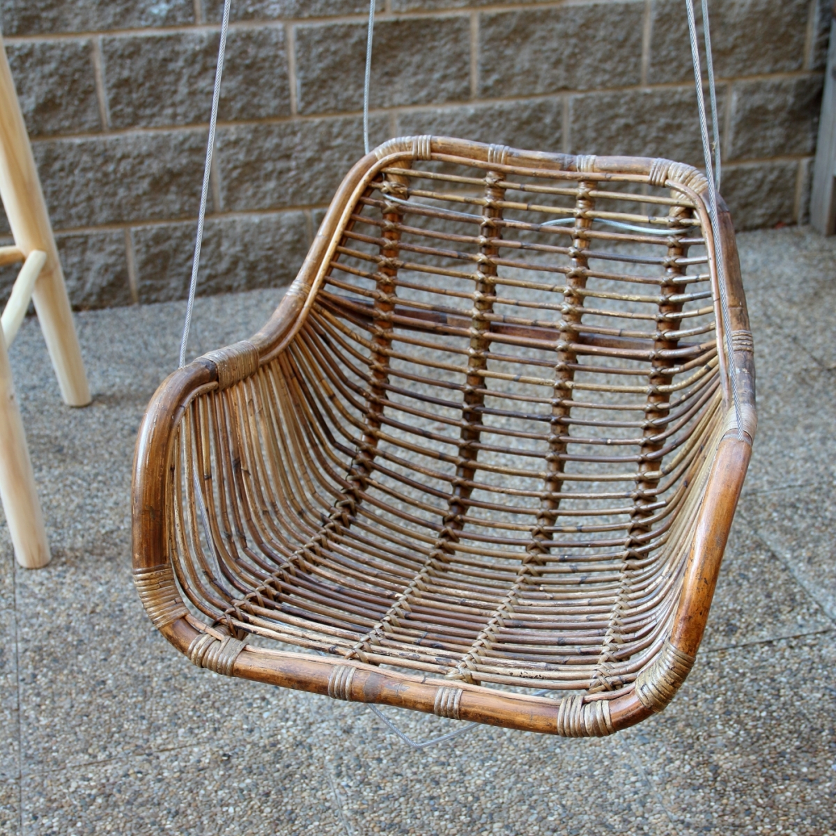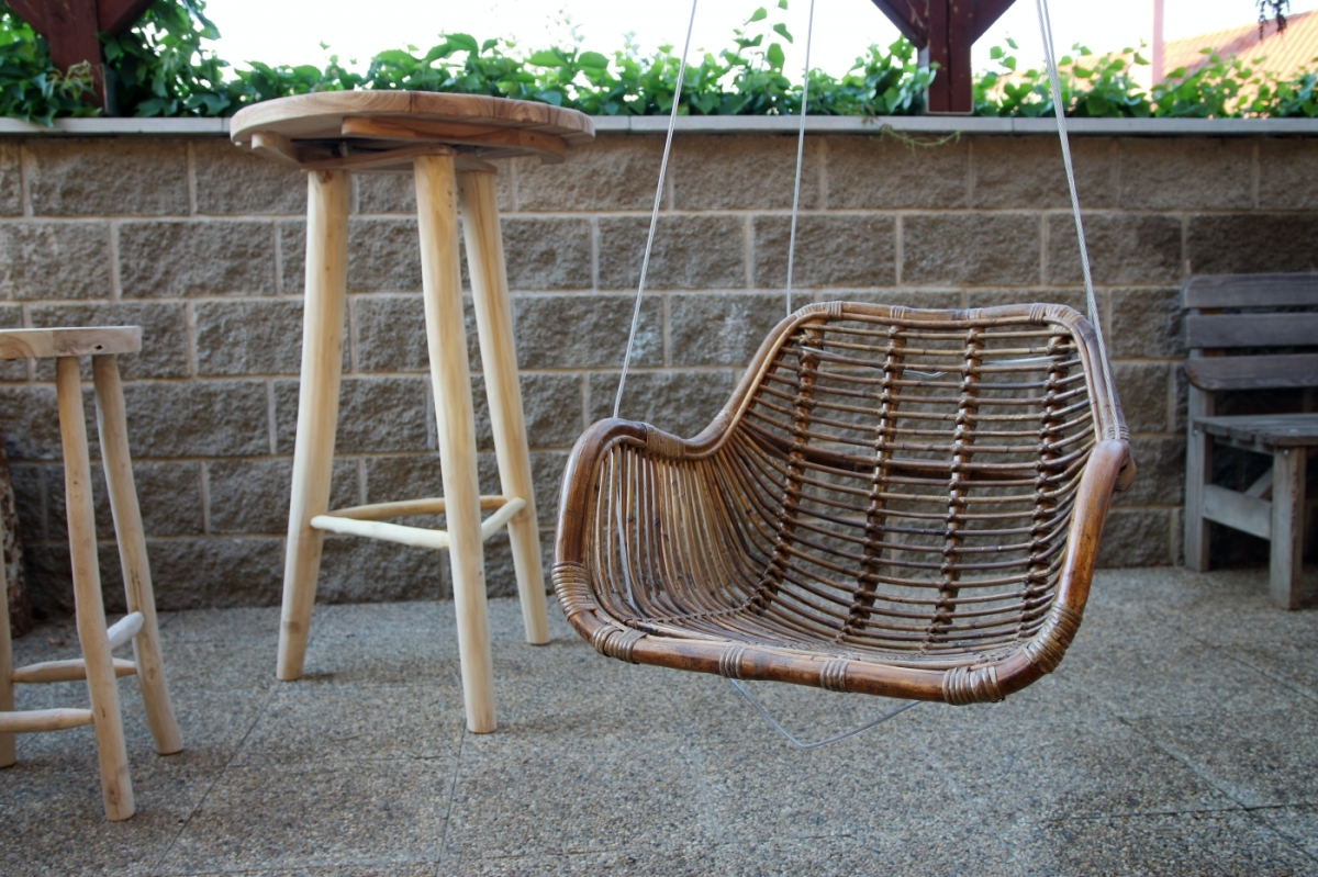 Závesné kreslo ručne vyrobené z plného pevného ratanu.