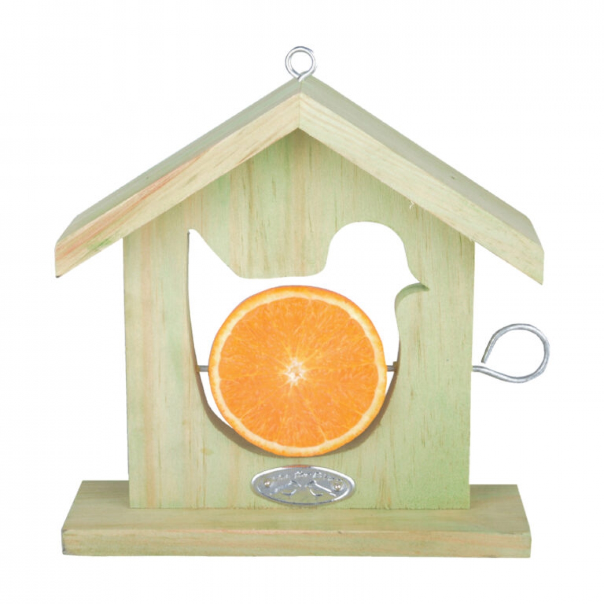 Kŕmidlo pre vtáčiky s vyrezaným otvorom s kovovou ihlicou pre napichnutie požadovaného kusu ovocia alebo lojové kŕmne gule.