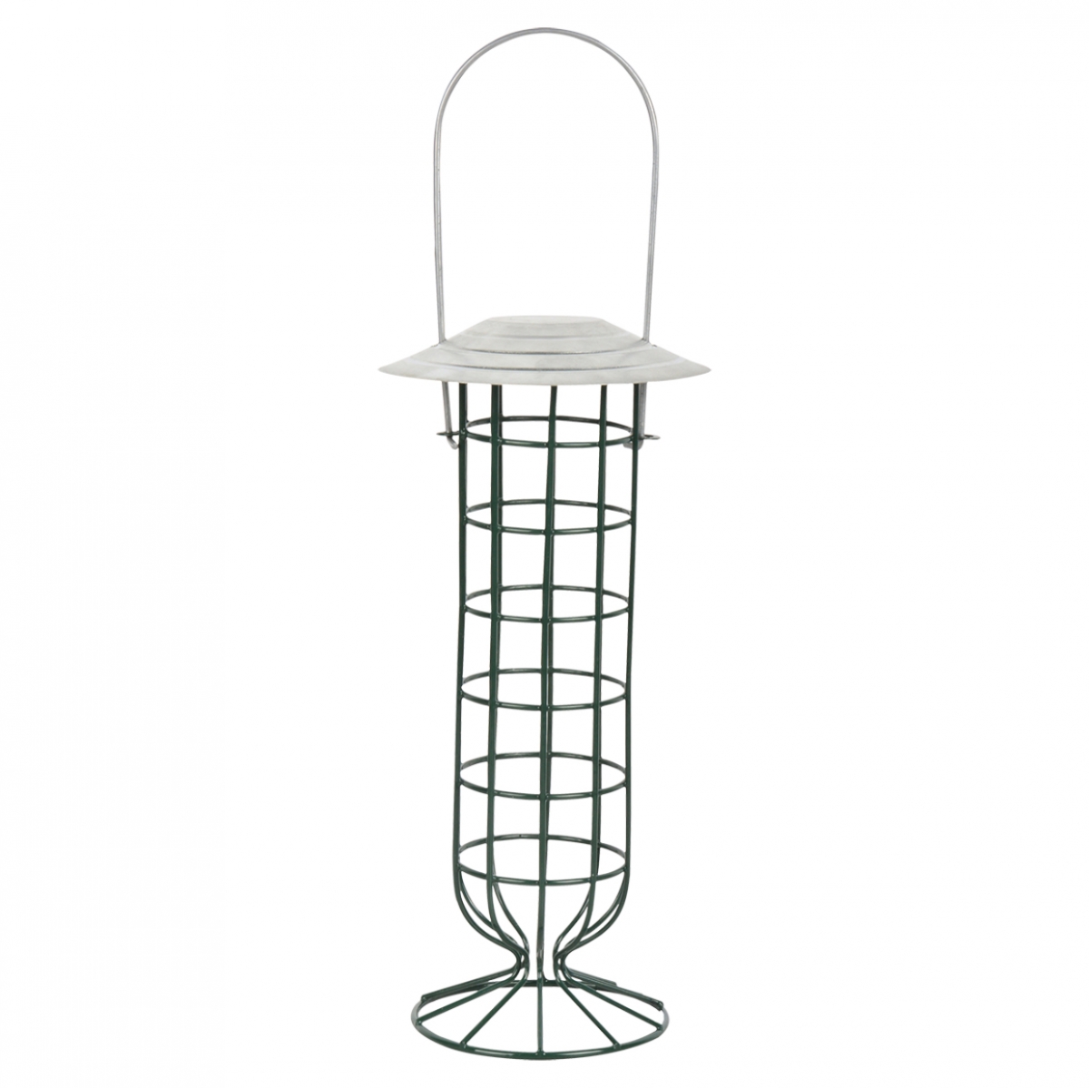 Závesné krmítko pre vtáčiky so zinkovou strieškou a kovovým úchytom.