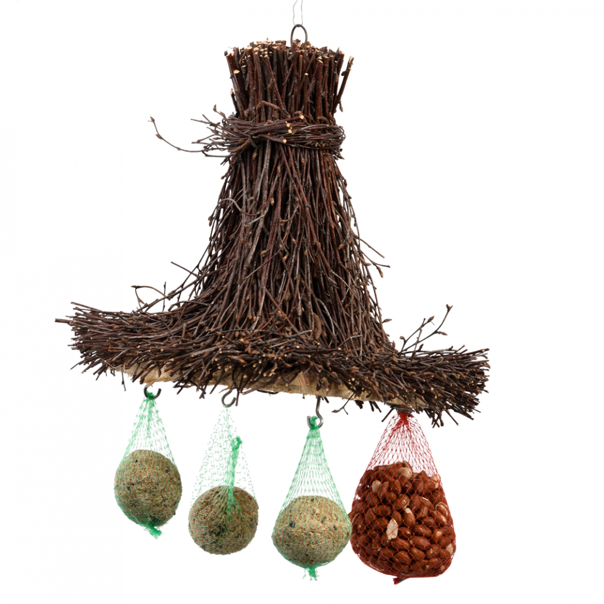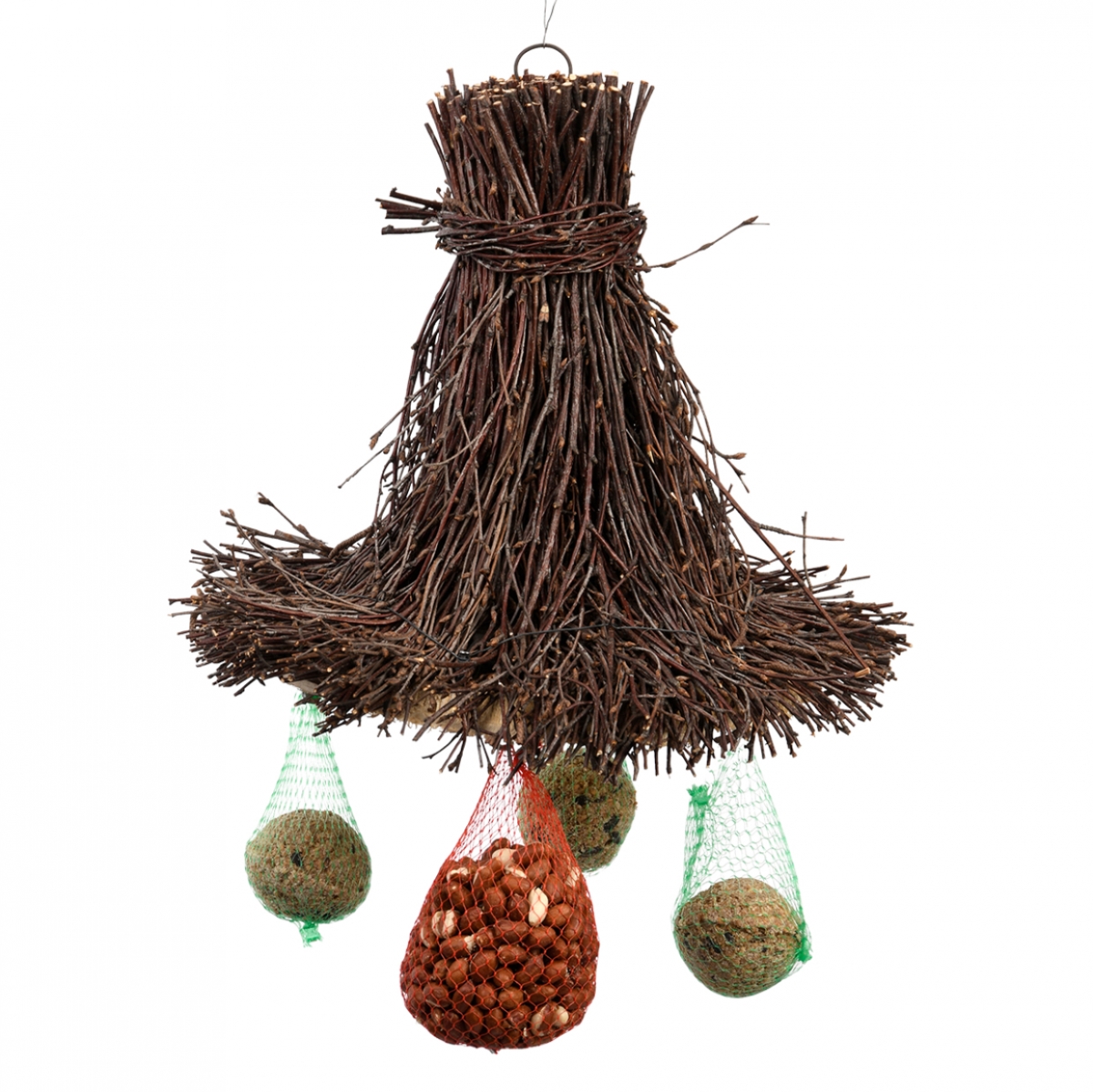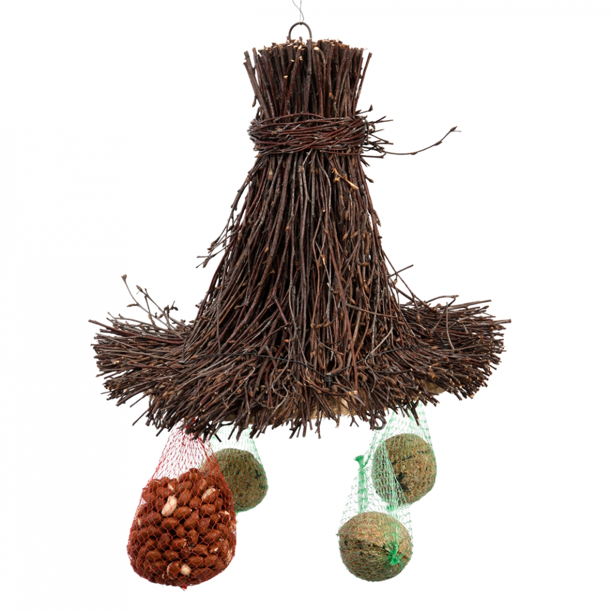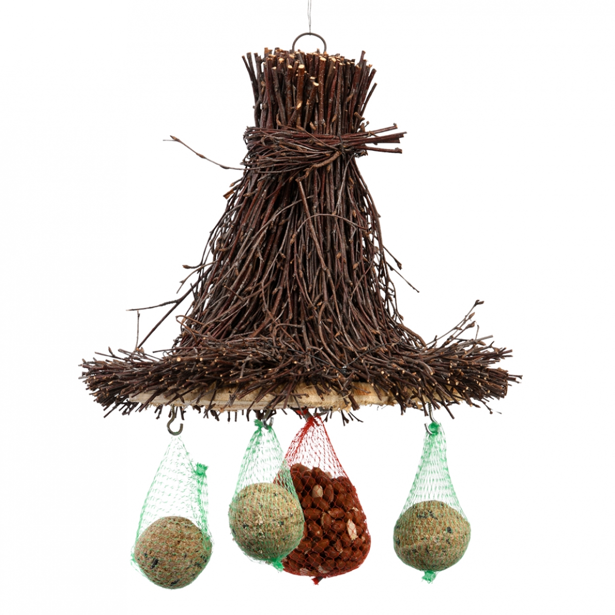 Závesné krmítko pre vtáčiky je vyrobené z brezových vetvičiek. Kŕmidlo je vhodné pre rôzne druhy vtáčieho krmiva.