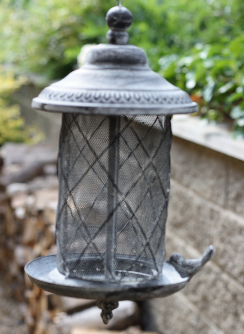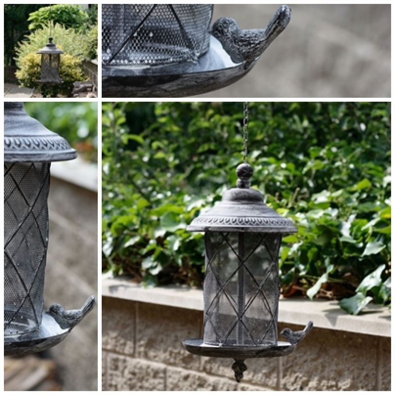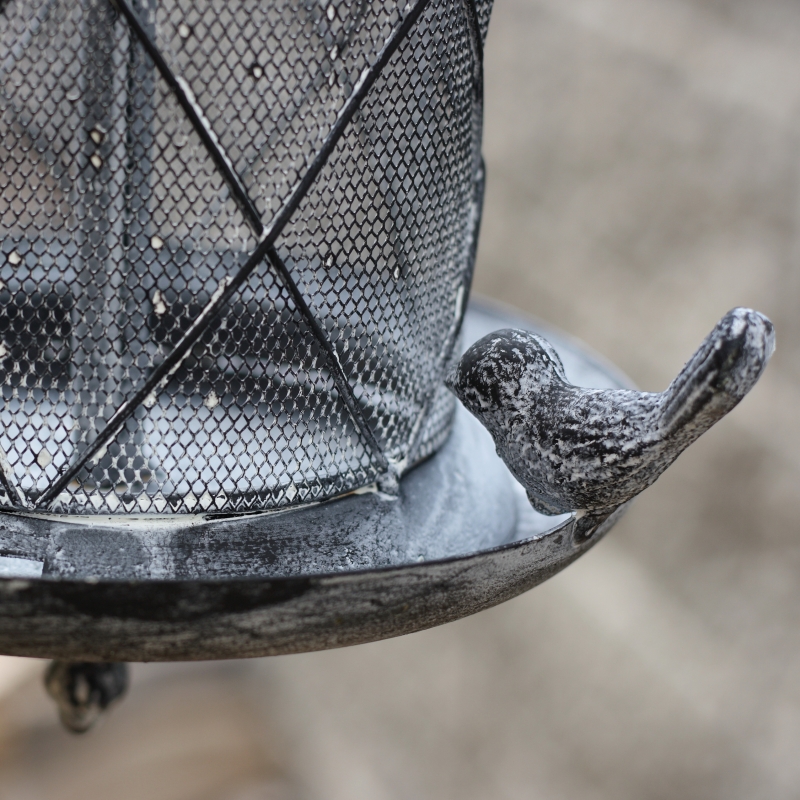 Kŕmidlo má praktickú striešku a spodnú misku. Je celé z kovu zdobené ornamentmi a patinou. Kŕmidlo je zavesené na retiazke, za ktorý ho jednoducho zavesíte na pergolu alebo strom na záhrade.
