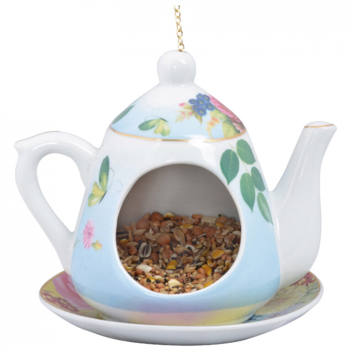 Závesné krmítko pre vtáky kanvička v modrom odtieni s kvetmi