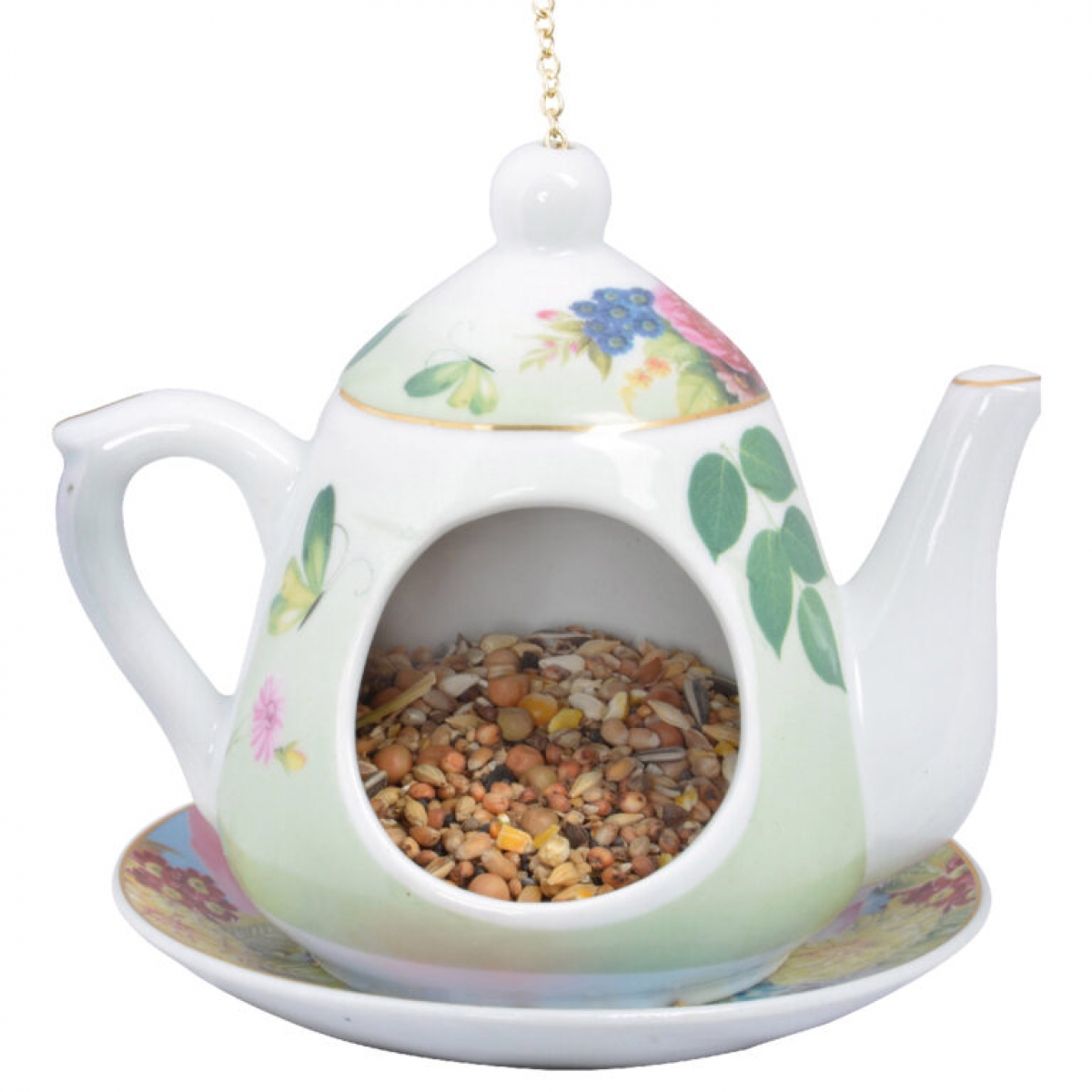 Závesné krmítko pre vtáky v podobe kanvičky s kvetinovou potlačou na zelenom podklade