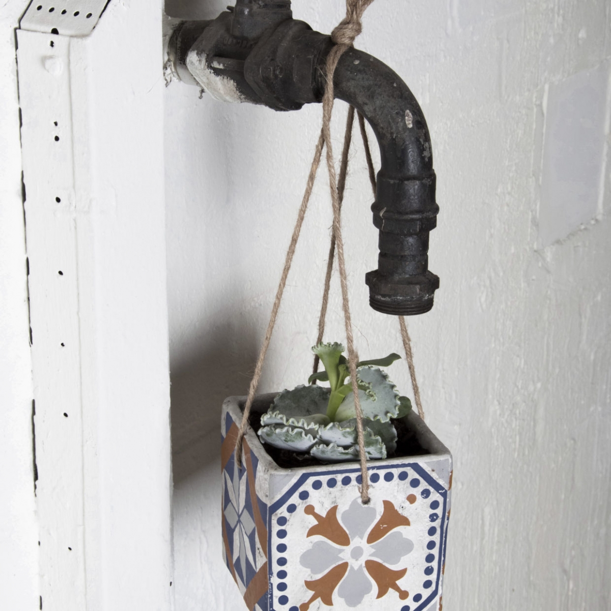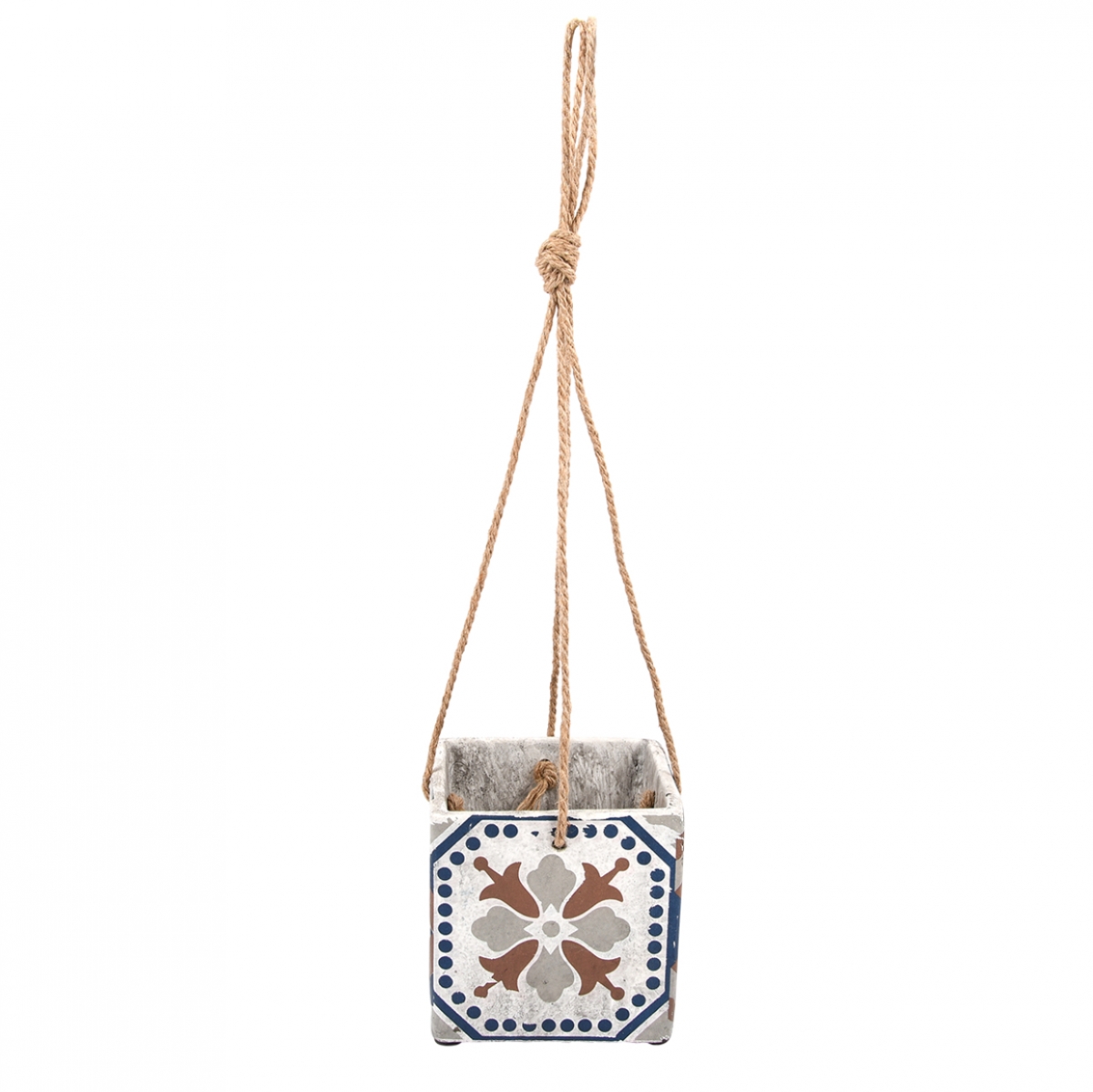 Závesný kvetináč / obal na kvetináč na zavesenie z kolekcie portugalskej keramiky na jutovom závesu.