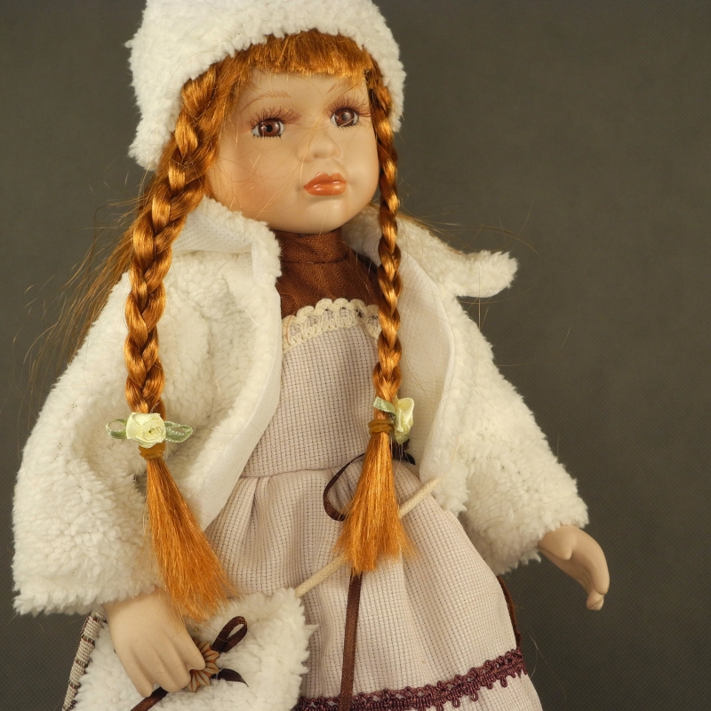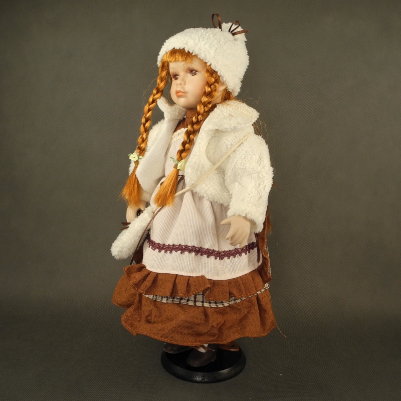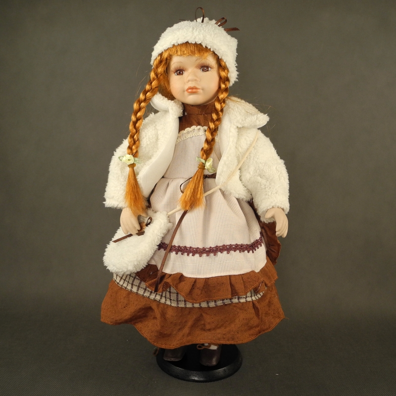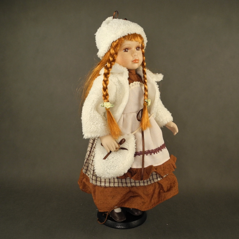 Zberateľská porcelánová bábika má oblečený biely zimné kabátik, dlhé hnedo šedé šaty a teplú čiapku. Cez rameno má kabelku zdobenú kytičkou a mašľou.