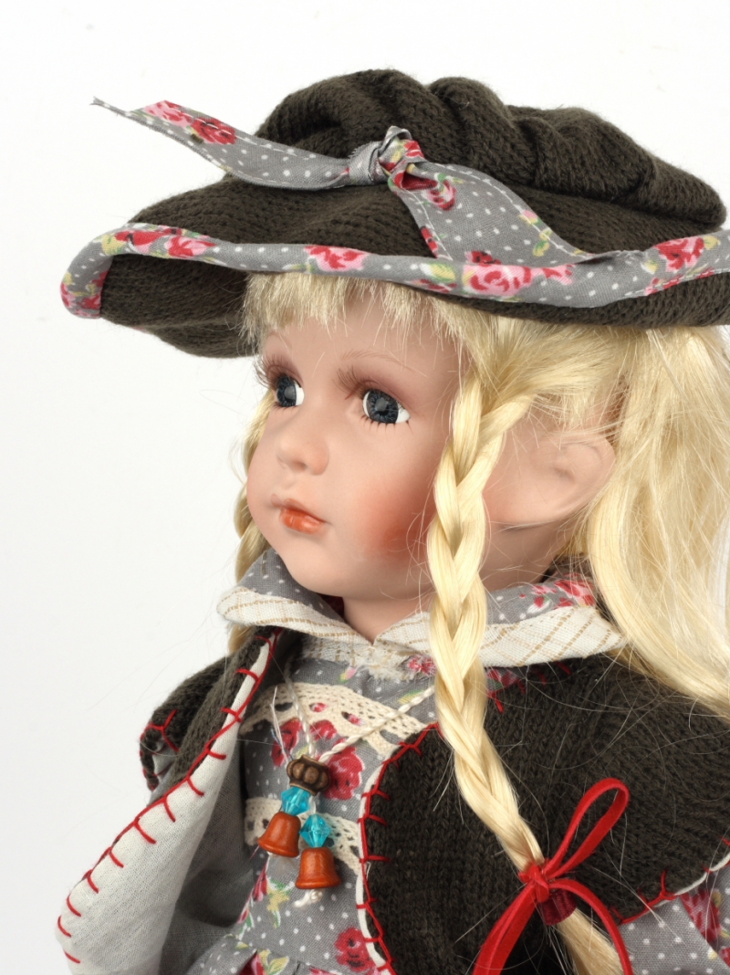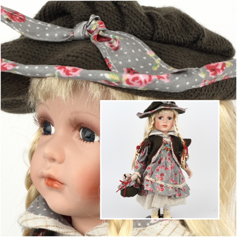 Zberateľská porcelánová bábika Rosemary 40cm má obléknuté prekrásne vidiecke šaty s kvetmi ruží, pletené bolerko, zladený klobů aj košíček s medvedíkom. Dlhé rovné blod vlasy má rozpustené a na oboustranách tváre má zapletené dva malé vrkôčiky.