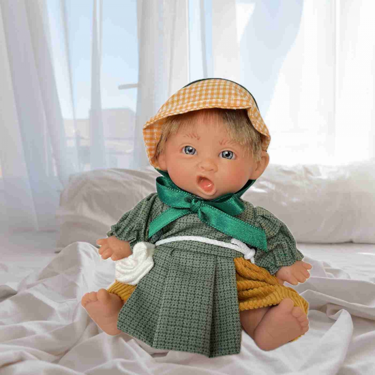 Má pohyblivú otáčaciu hlavu, aby ste pri aranžovaní mohli natočiť pohľadovú časť presne tam, kam potrebujete. Bábika je určená na postavenie, alebo v sediacej polohe umiestnenie do retro kočíka. Na tento účel má pohyblivé nohy, umožňujúce posadenie.