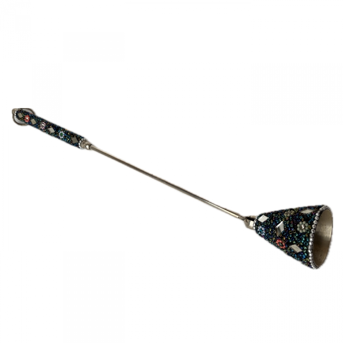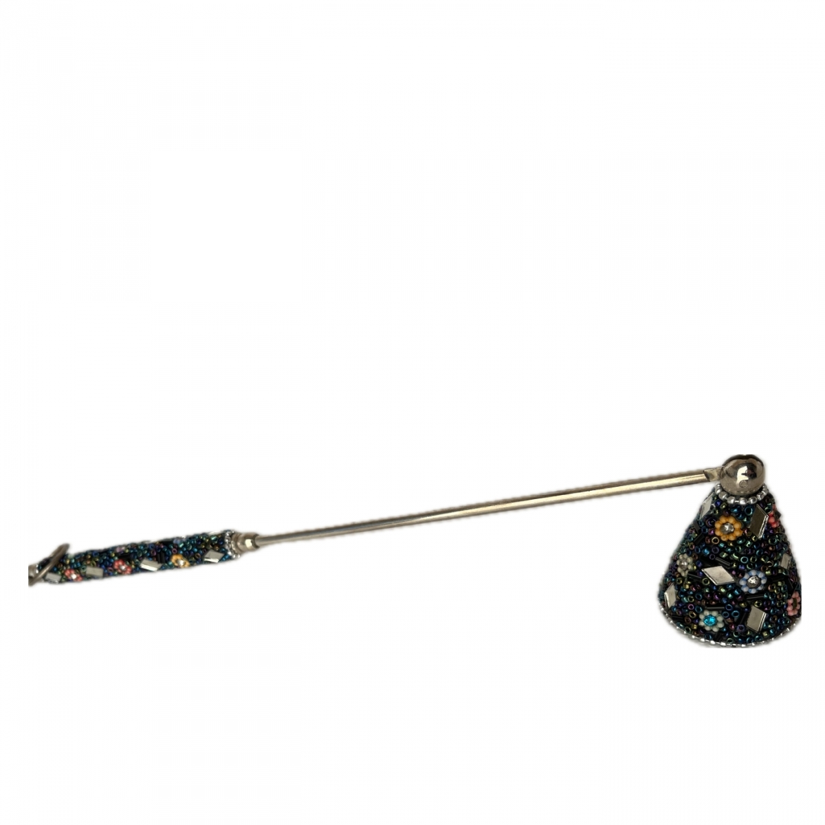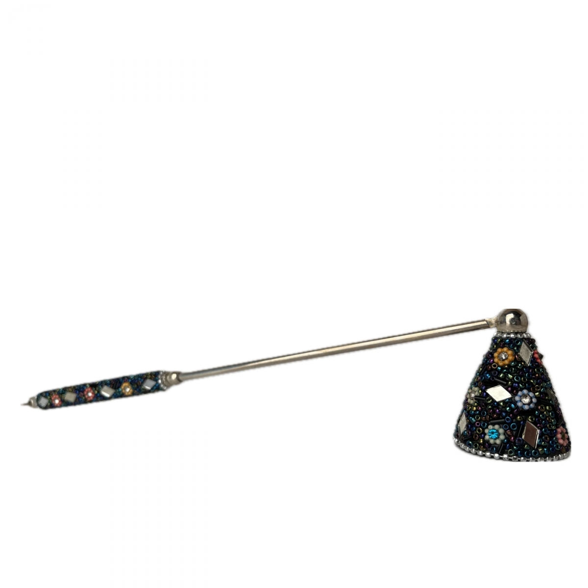 Zhášadlo na sviečky je vyrobené zo strieborného kovu, hlava zhasínatka a rukoväť sú zdobené drobnými farebnými korálkami a sklíčkami, ktoré sú ručne vkladané na povrch zhasínatka.