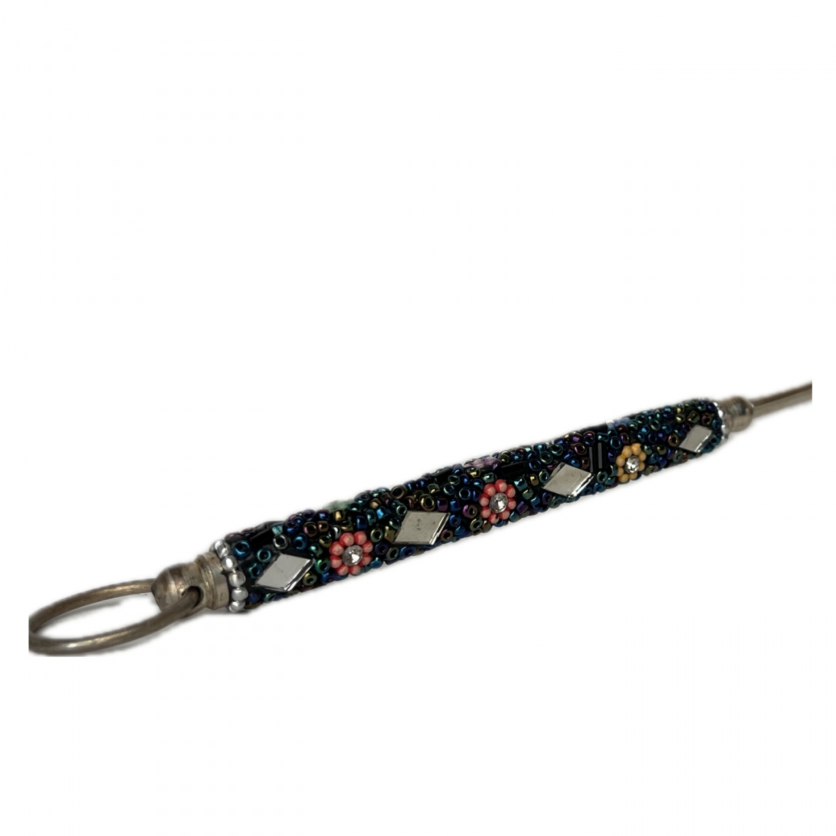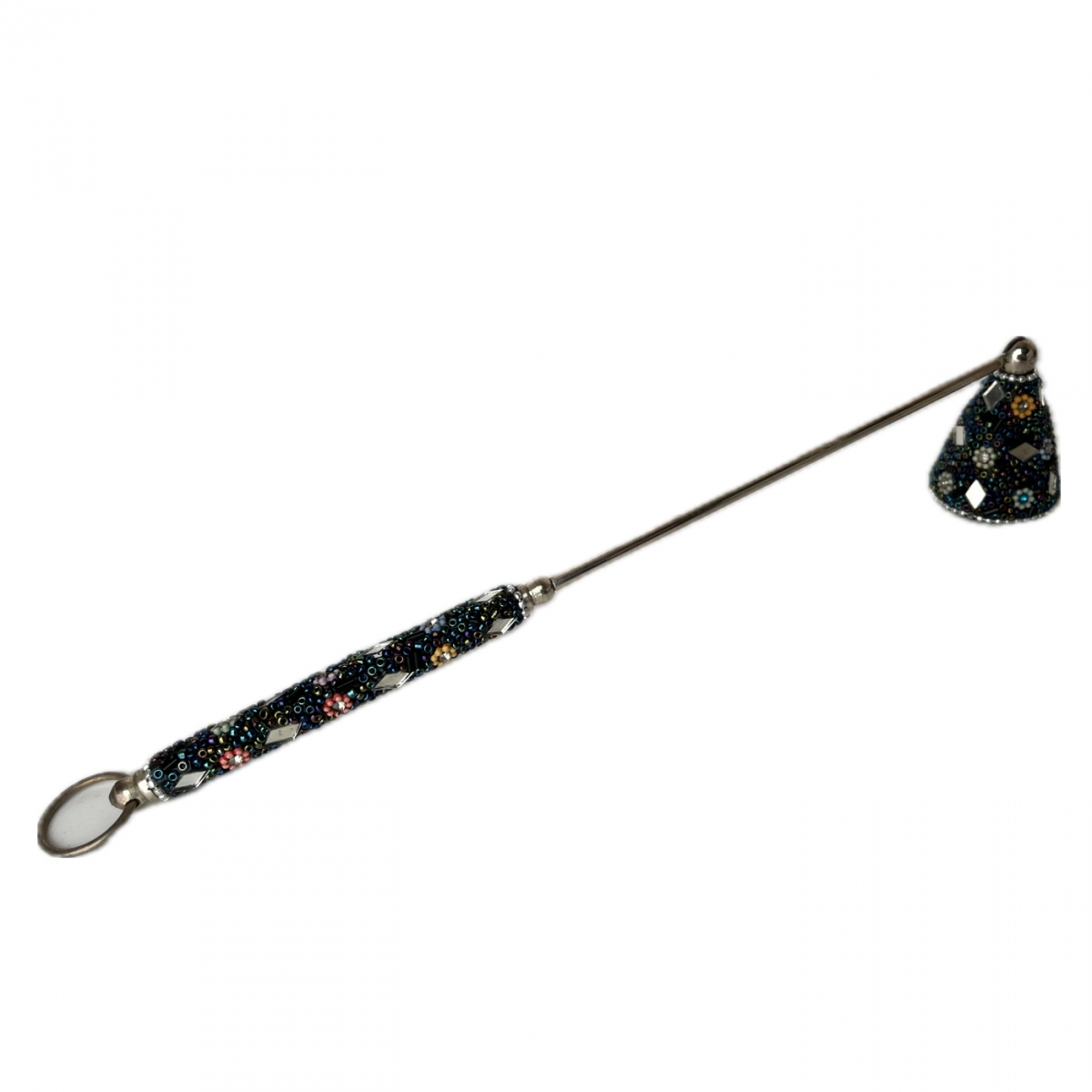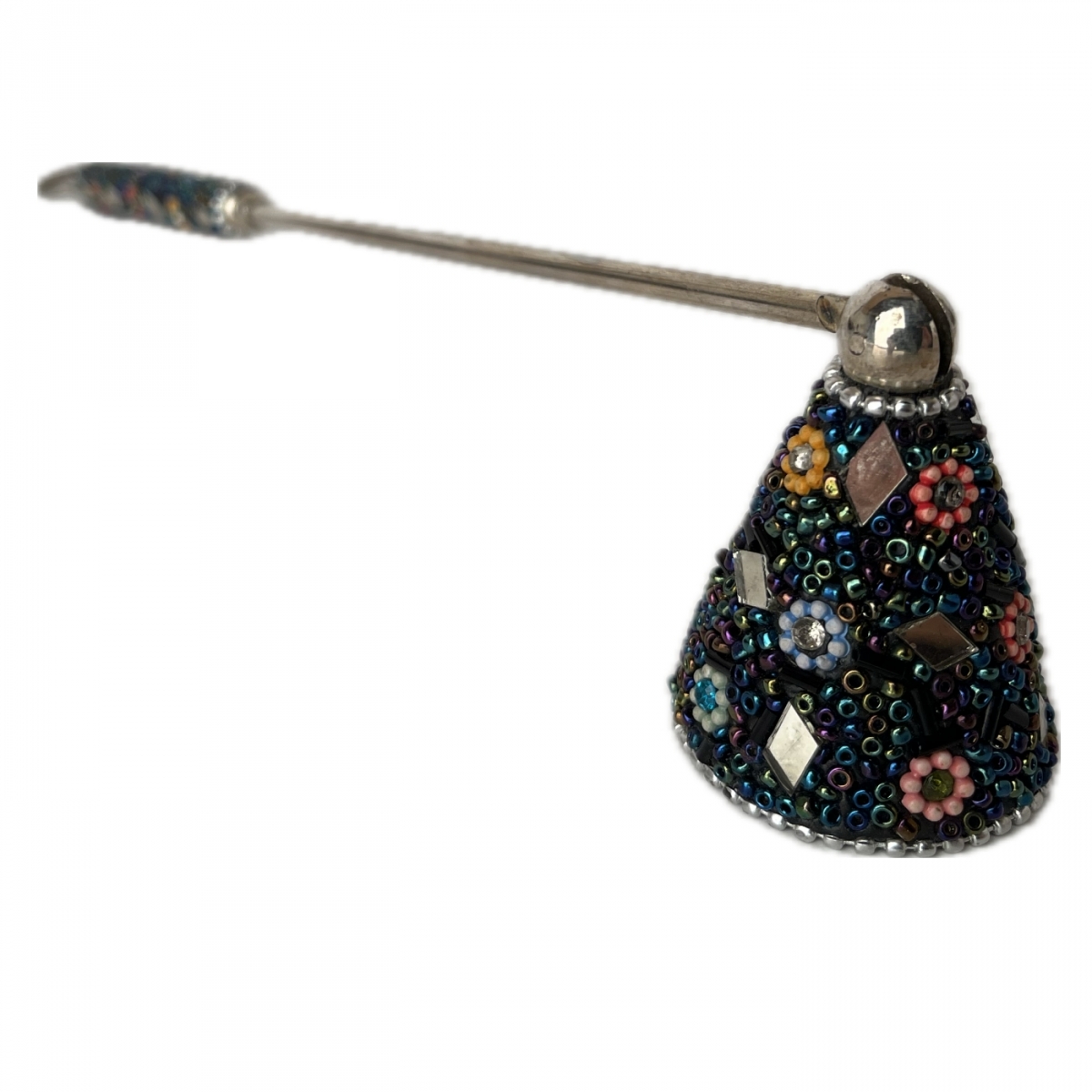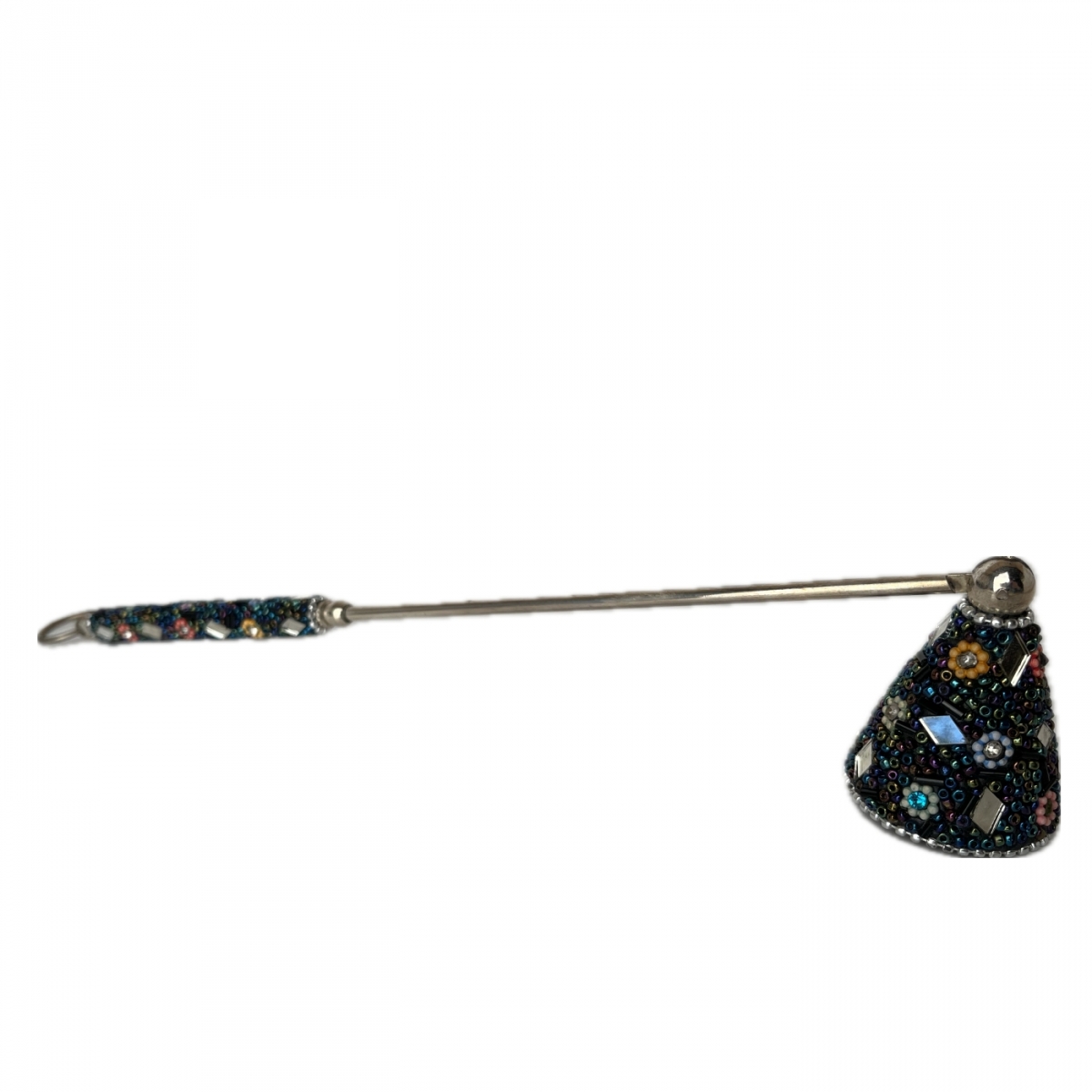 Zhášadlo na sviečky je vyrobené zo strieborného kovu, hlava zhasínatka a rukoväť sú zdobené drobnými farebnými korálkami a sklíčkami, ktoré sú ručne vkladané na povrch zhasínatka.