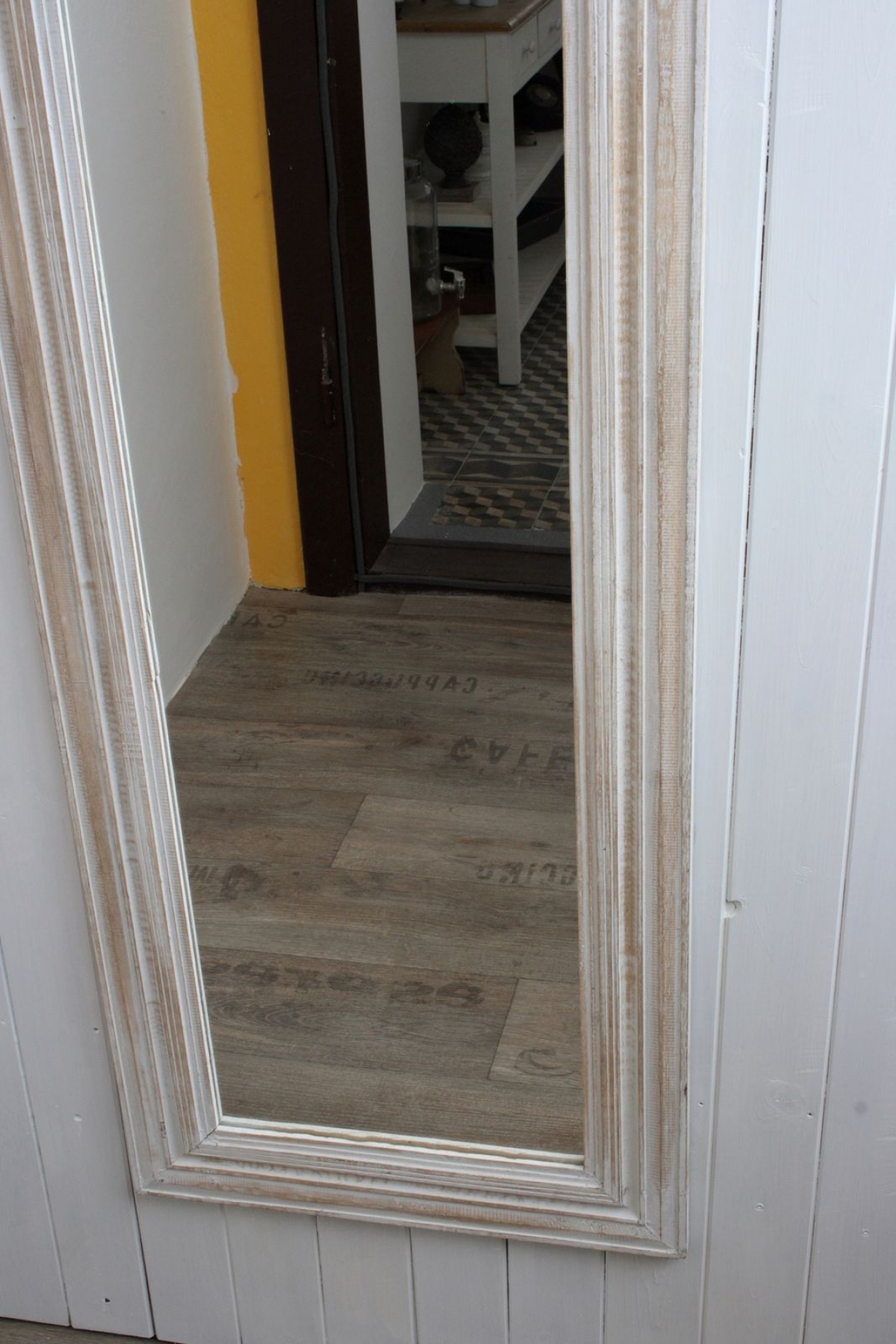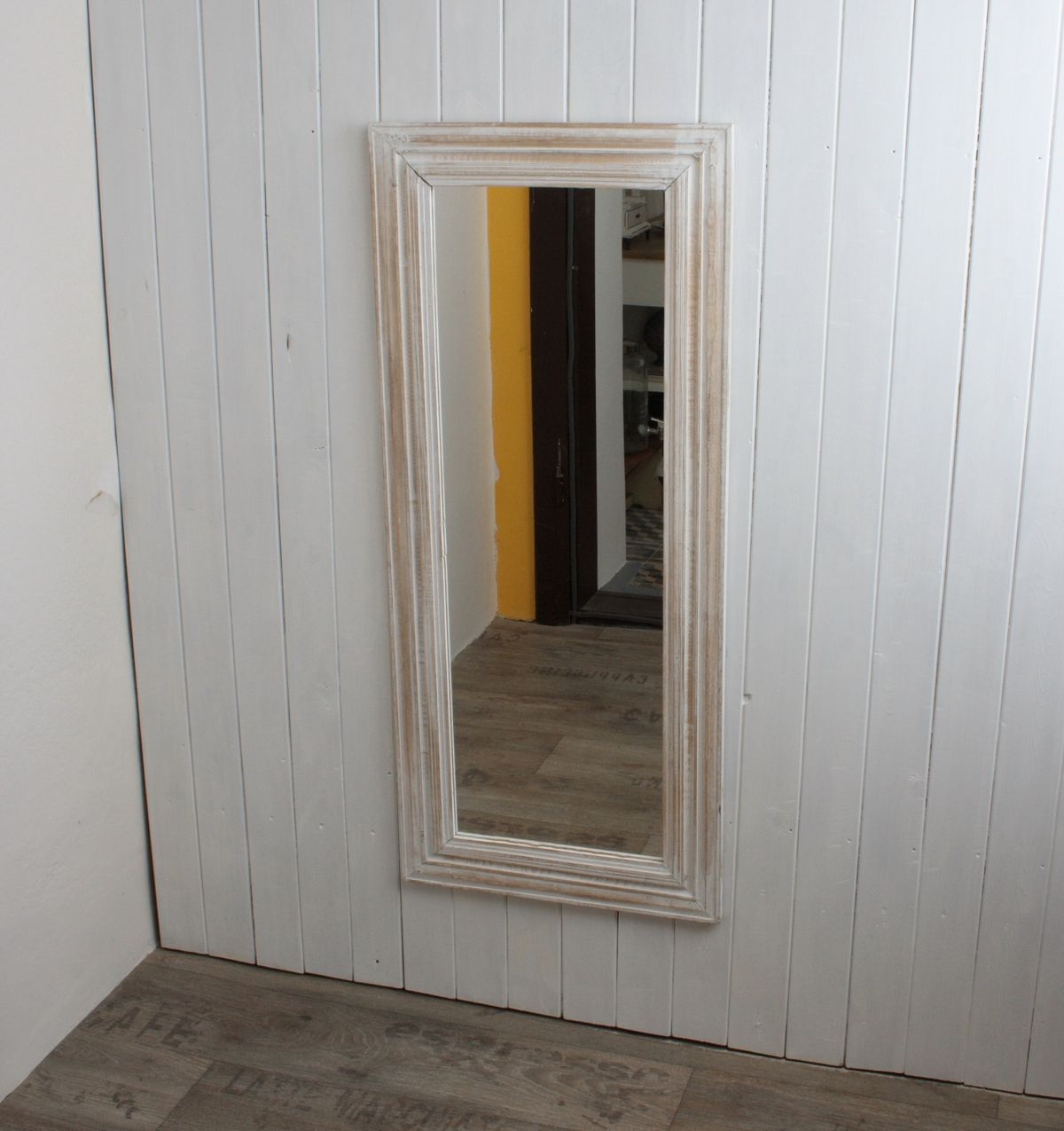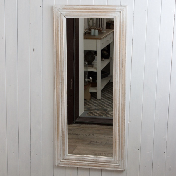 Zrcadlo s dřevěným rámem a bílou patinou 50x115cm je univerzální nástěnou dekorací, která navíc díky odrazu světla zvětší každý prostor.