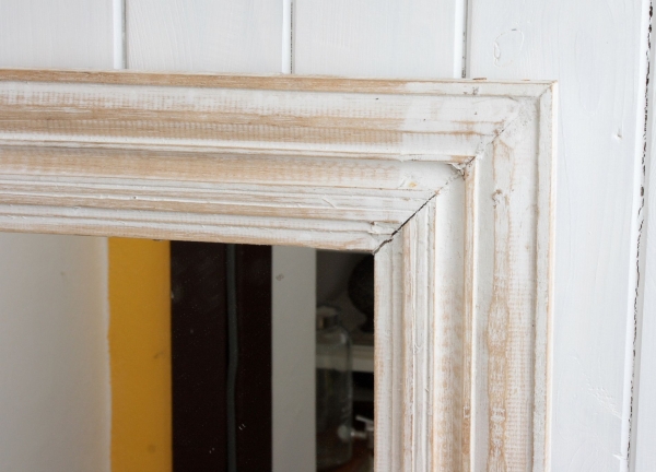 Zrcadlo je zasazeno do dřevěného rámu s výraznou bílou patinou, pod kterou prosvítá světlé dřevo.