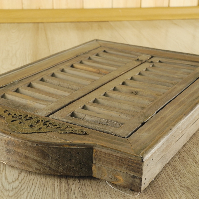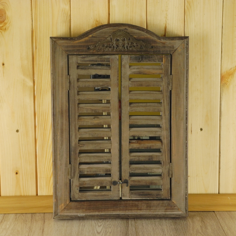 Zrkadlo má rozmer 31 x 45 cm. Na prvý pohľad pripomína okienko z drevenej drevenice. Ak necháte zatvorené " okenice " , nikto nepríde na to , čo sa za nimi vlastne skrýva. Zrkadlo je zasadené do dreveného rámu, aj okenice sú samozrejme drevené. Všetko je urobené v prírodných tónoch tak, ako sa pre tento štýl vintage hodí. V hornej časti je zrkadlo ozdobené lesklým kovovým prvkom. Okenice uzatvorte jednoducho háčikom.