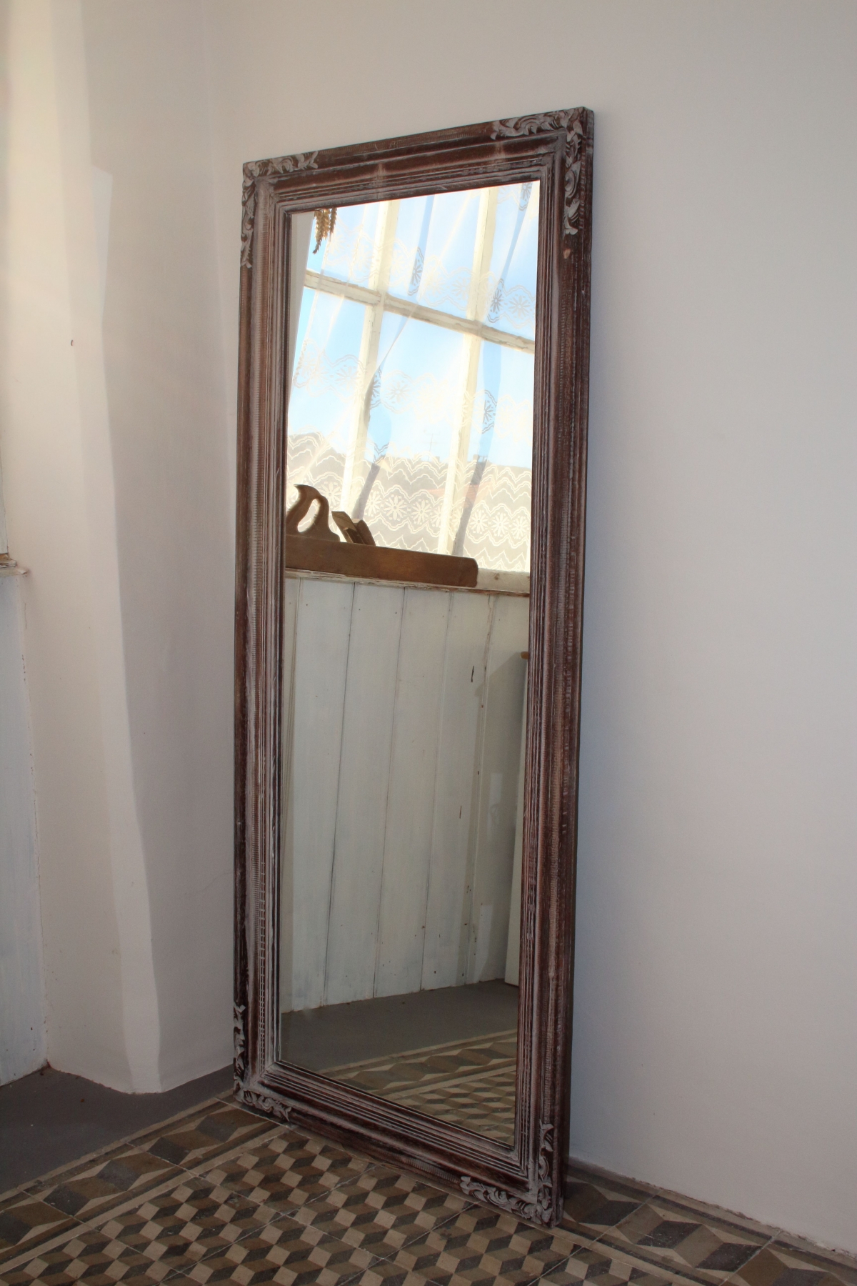 Zrkadlo s hnedým dreveným rámom a zdobením 75x165cm úžasne zväčší priestor a dodá mu elegantný vzhľad.