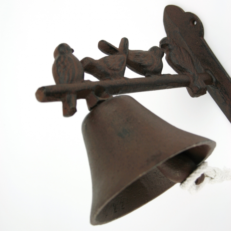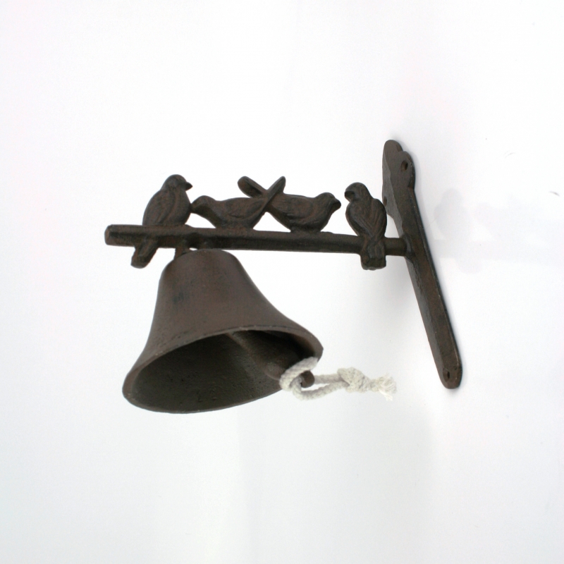 Zvonček s vtáčikmi je vyrobený z kvalitnej liatiny. Zvonček je zavesený na konzolu, ktorá sa pripevňuje na stenu. Upevnenie je veľmi jednoduché (3 otvory na skrutky).